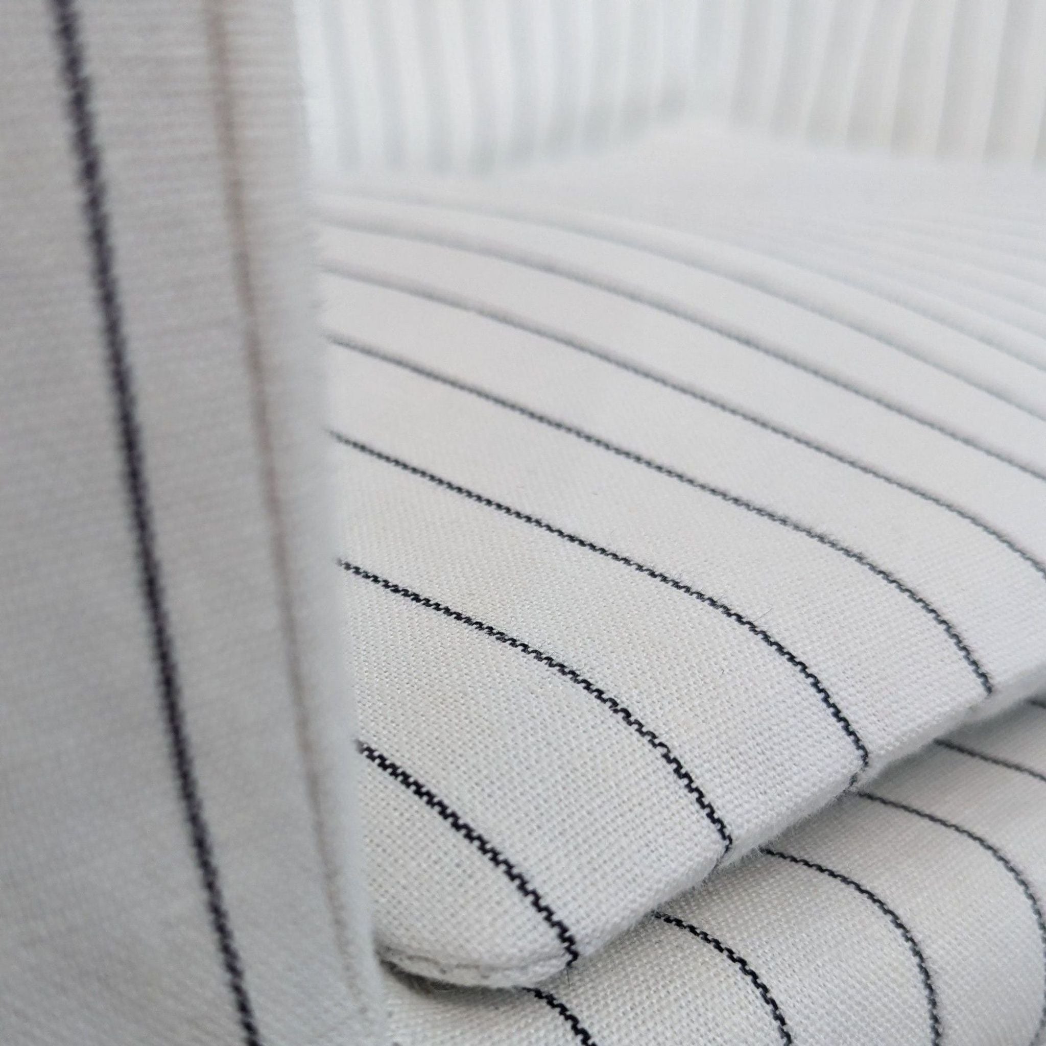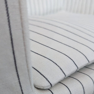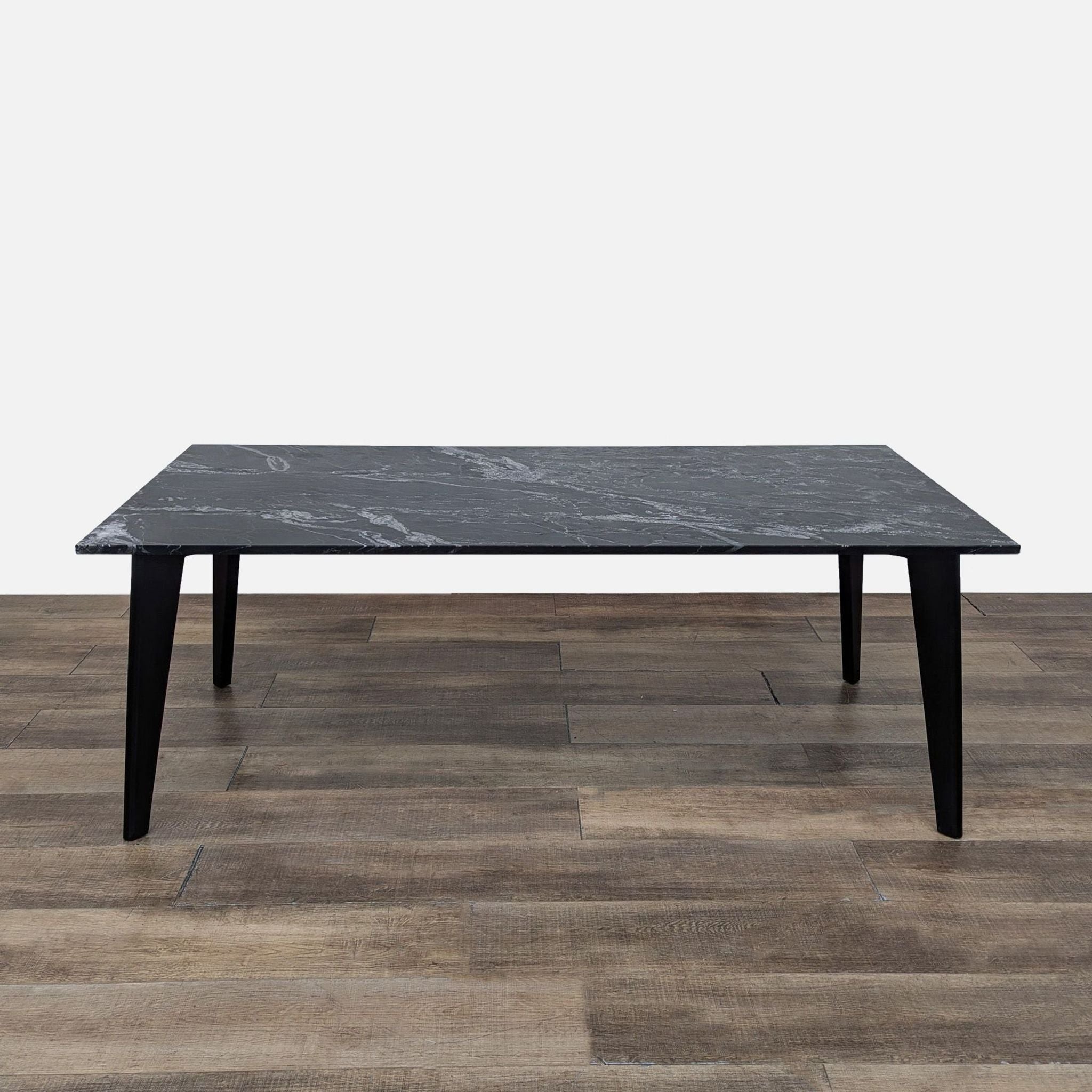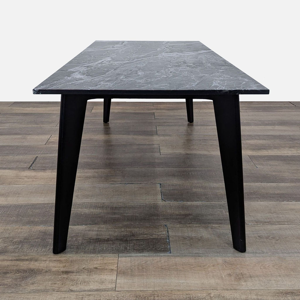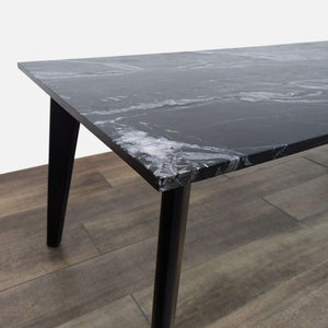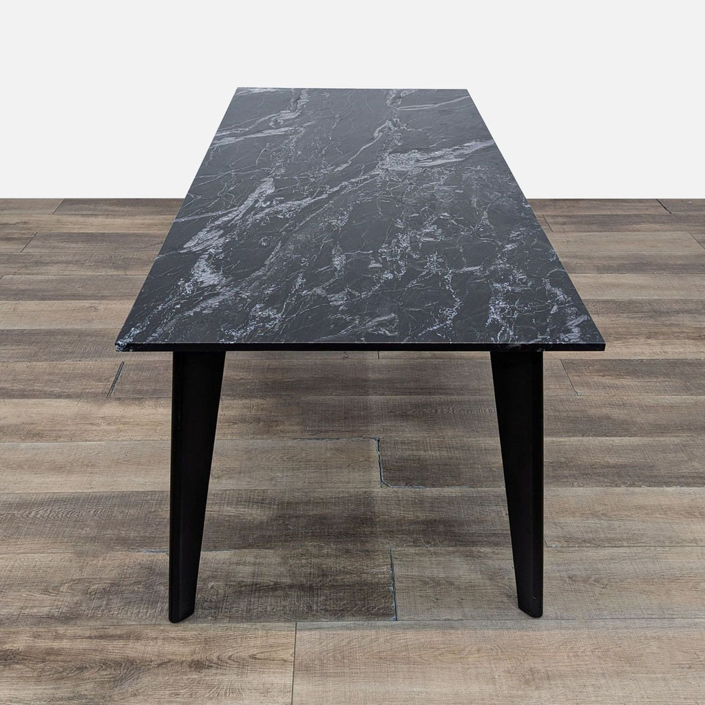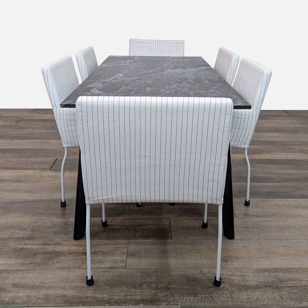 Harper black marble dining table with 6 Drop ivory and black strip dining chairs with metal frame.