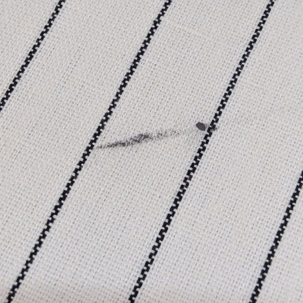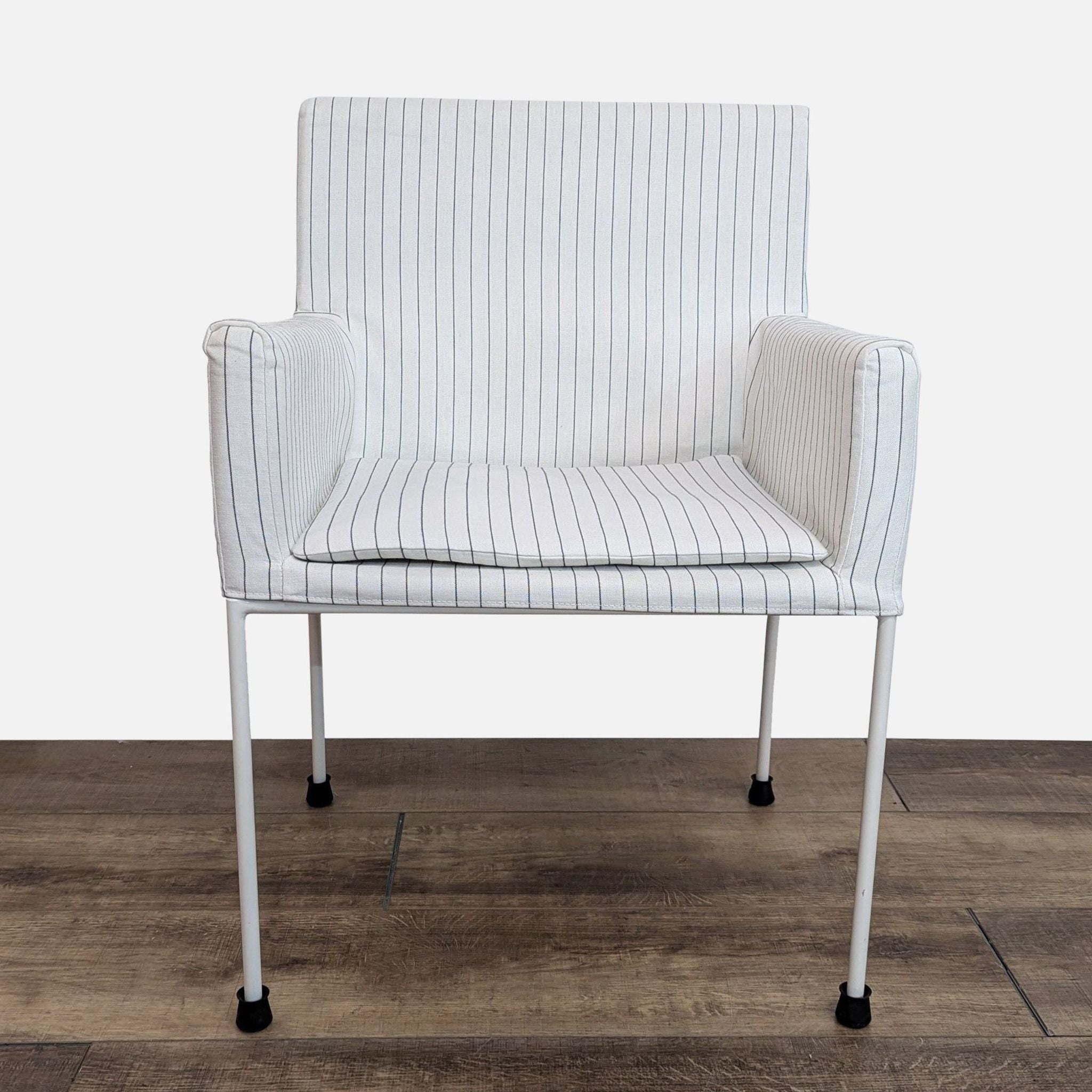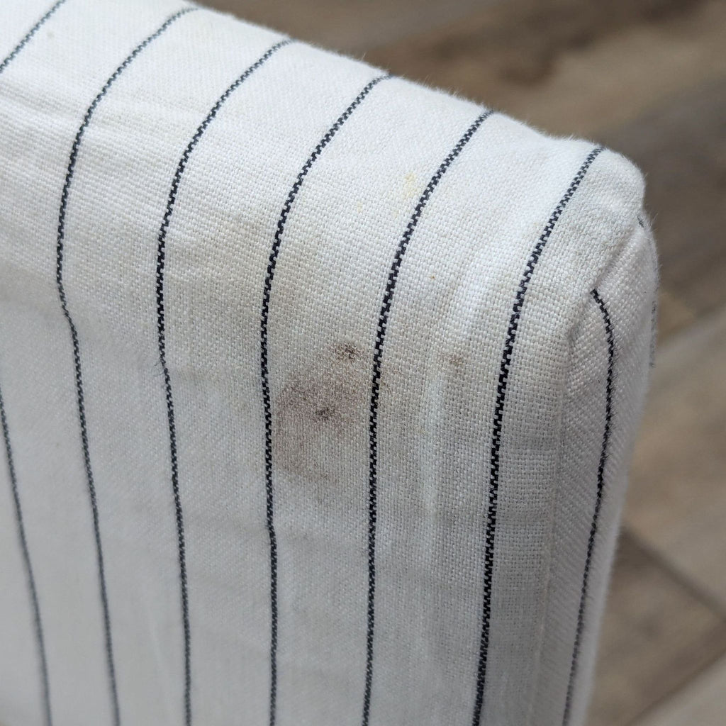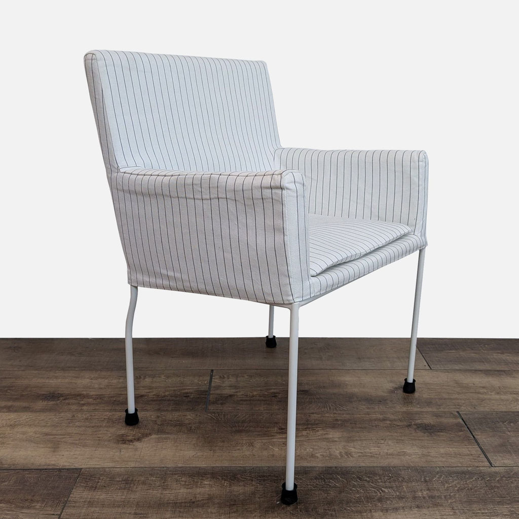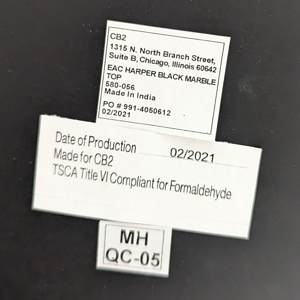 Harper black marble dining table with 6 Drop ivory and black strip dining chairs with metal frame.