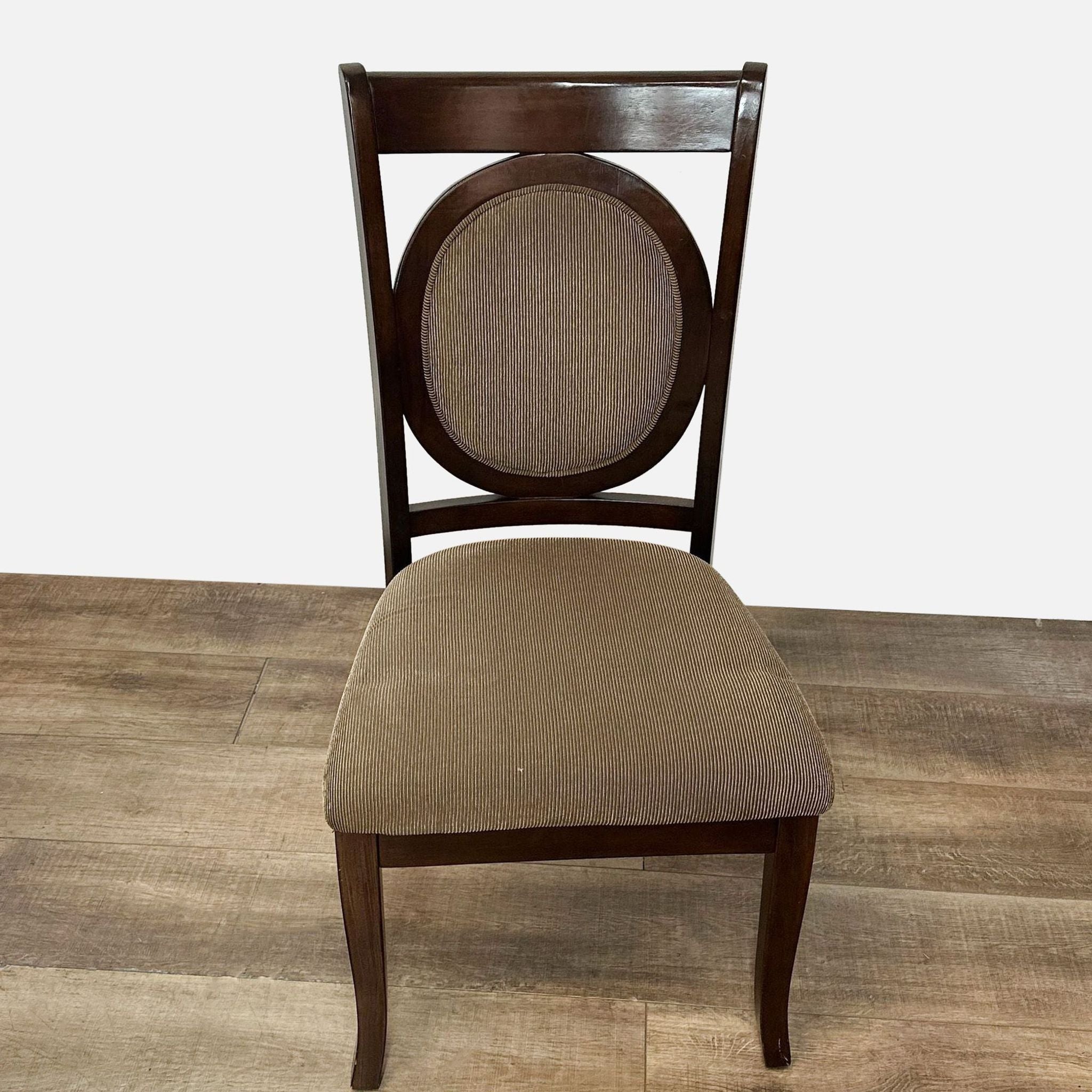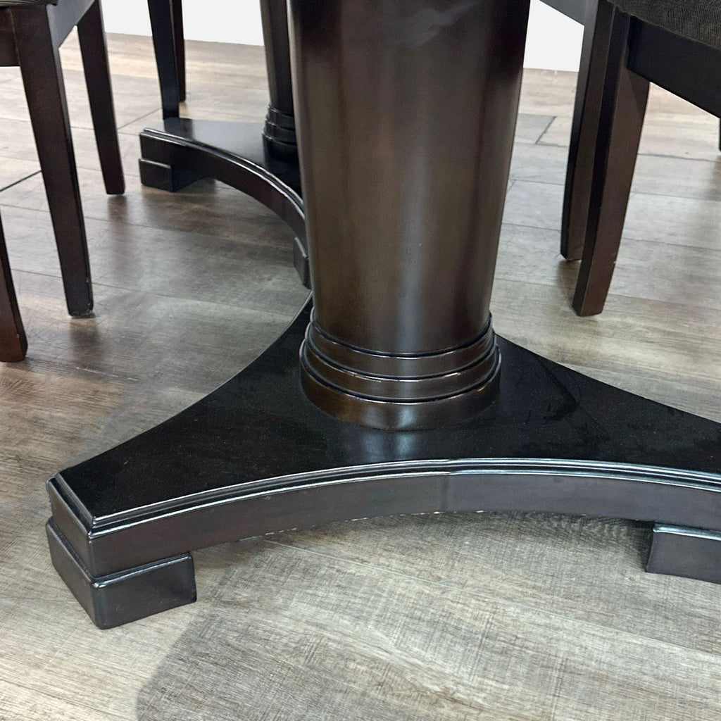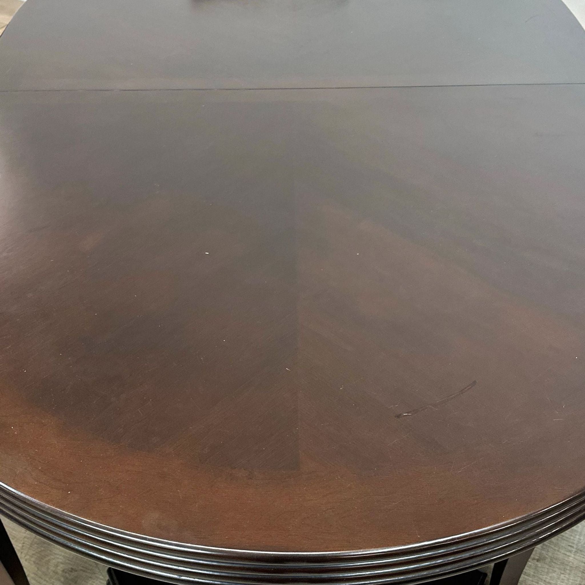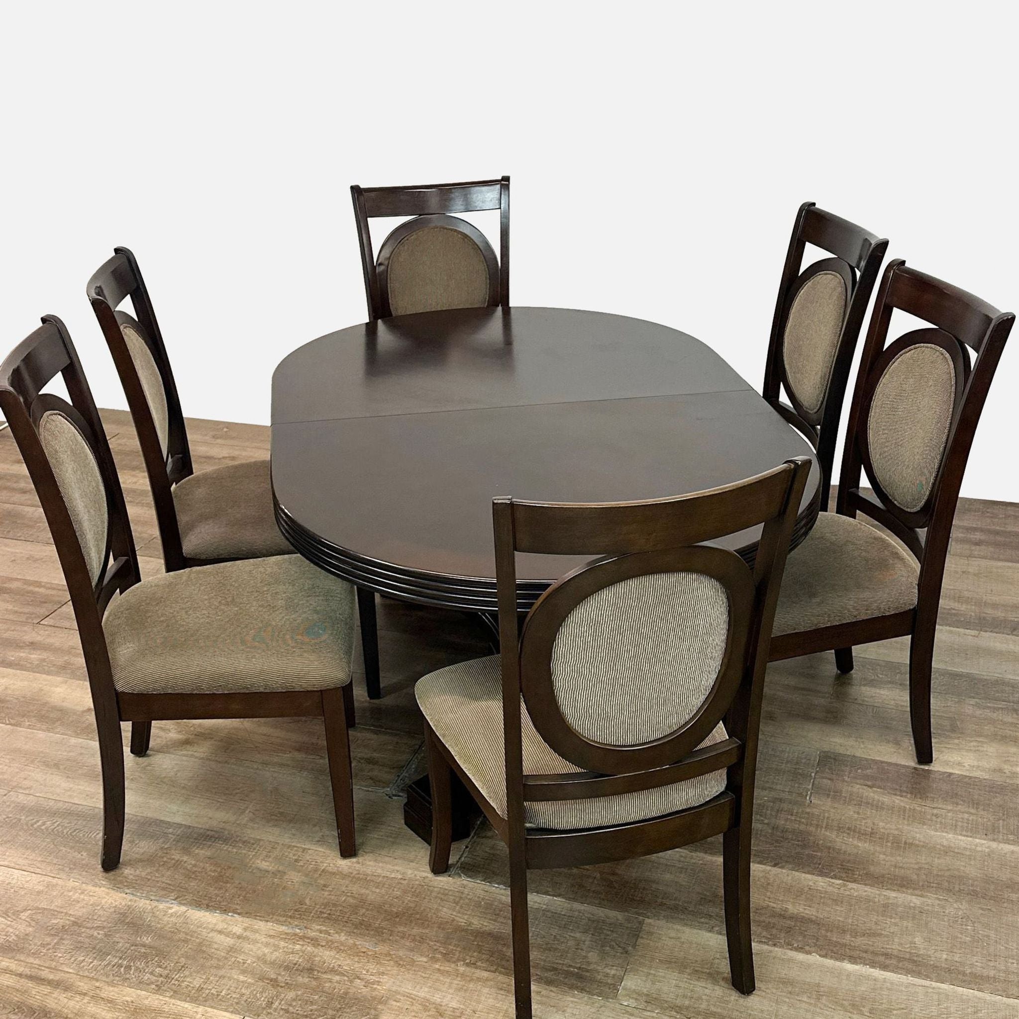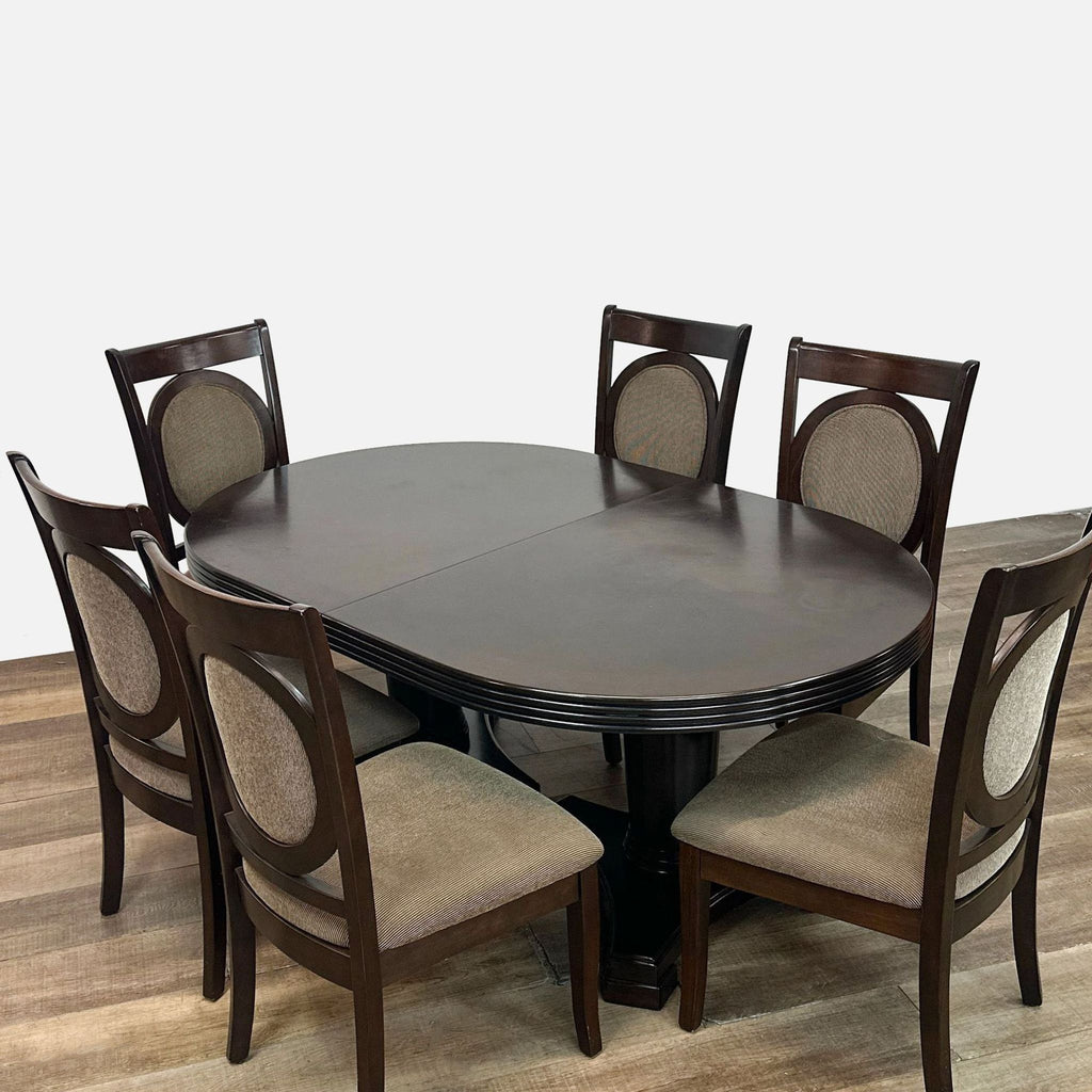 The Evelyn dark walnut dining set features an oval dining table with a double pedestal base and extension leaf and includes 6 matching dining chairs with upholstered seats.