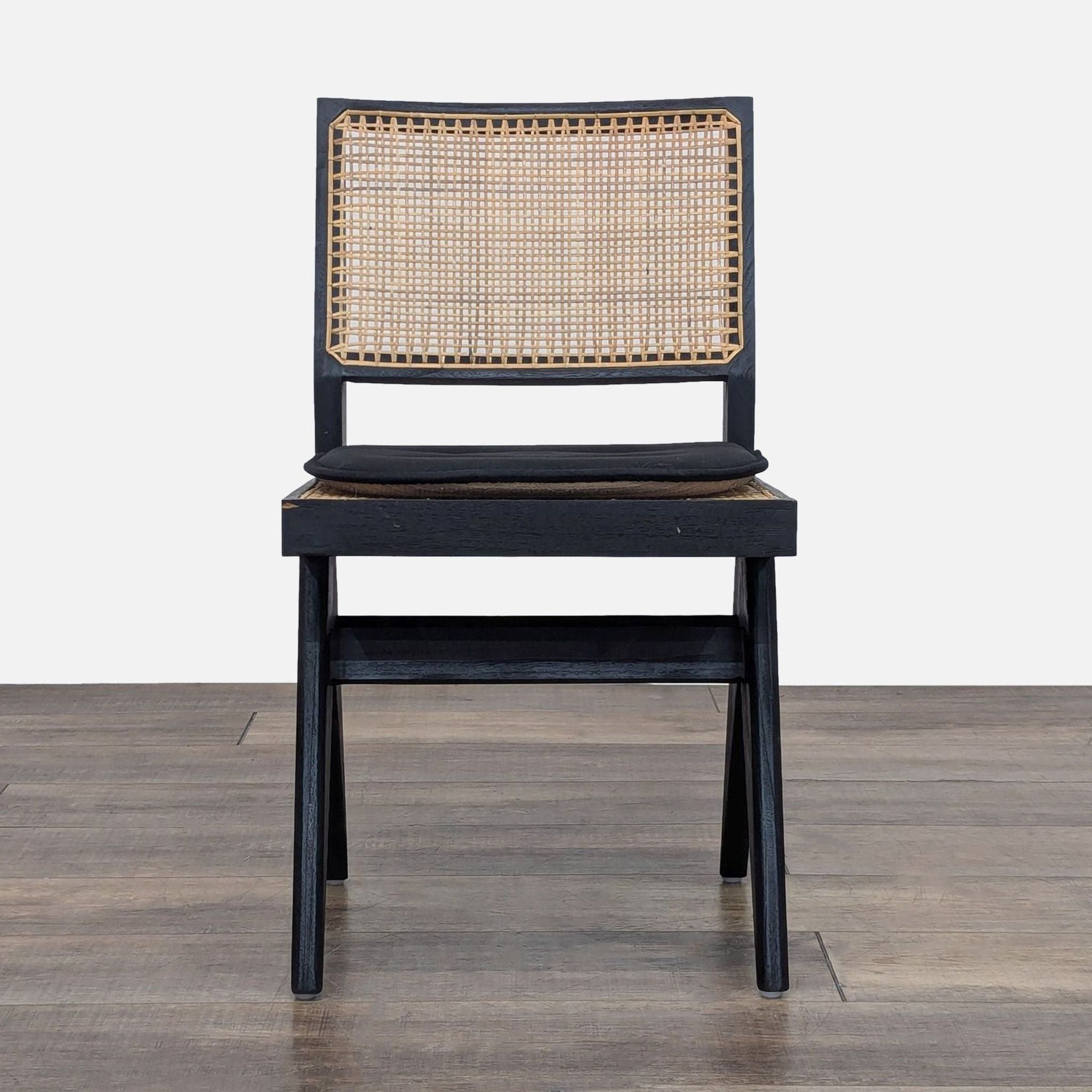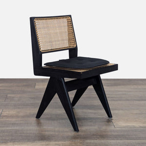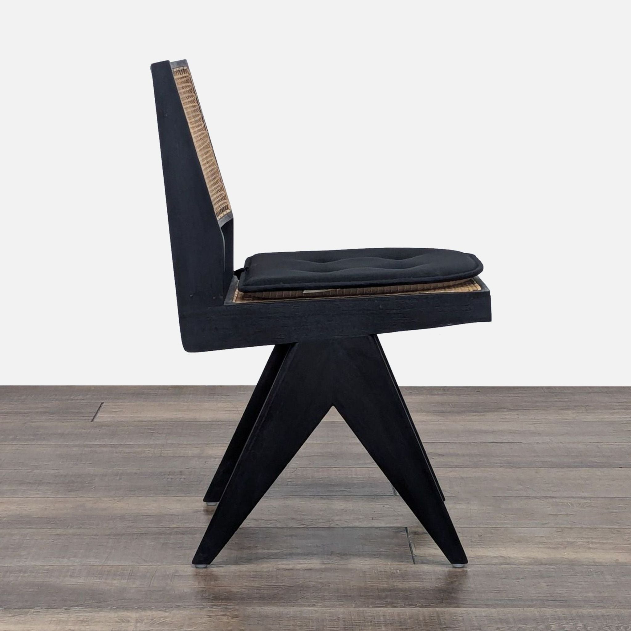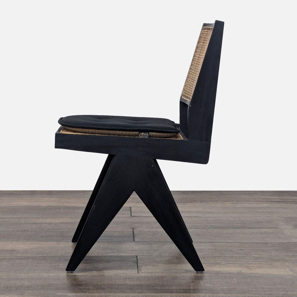 The chair is made of teak wood with rattan caning. The angular construction mirrors the arms of a compass. (Note: the chair is sold with the cushion, although it is not part of the original chair)