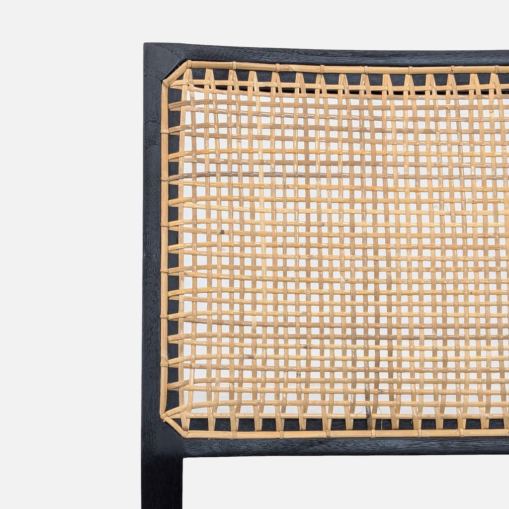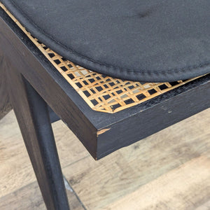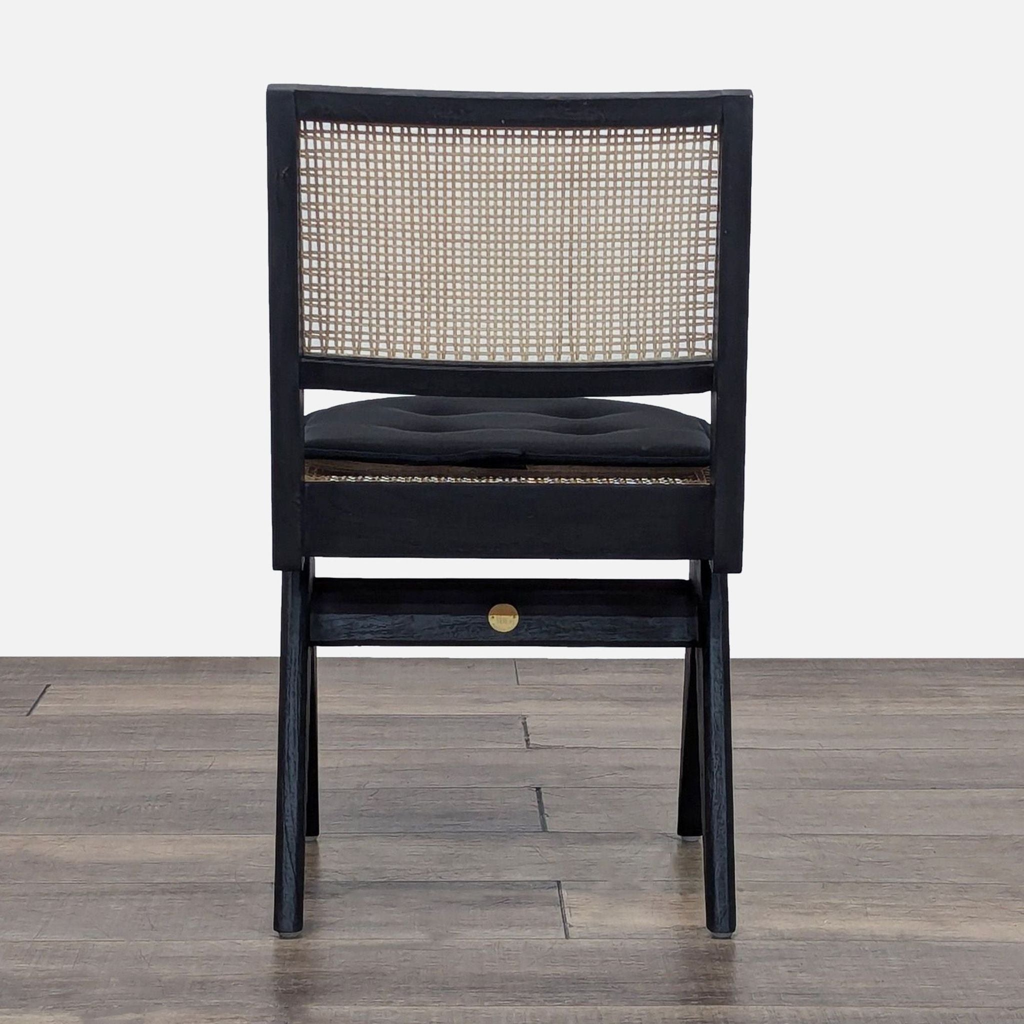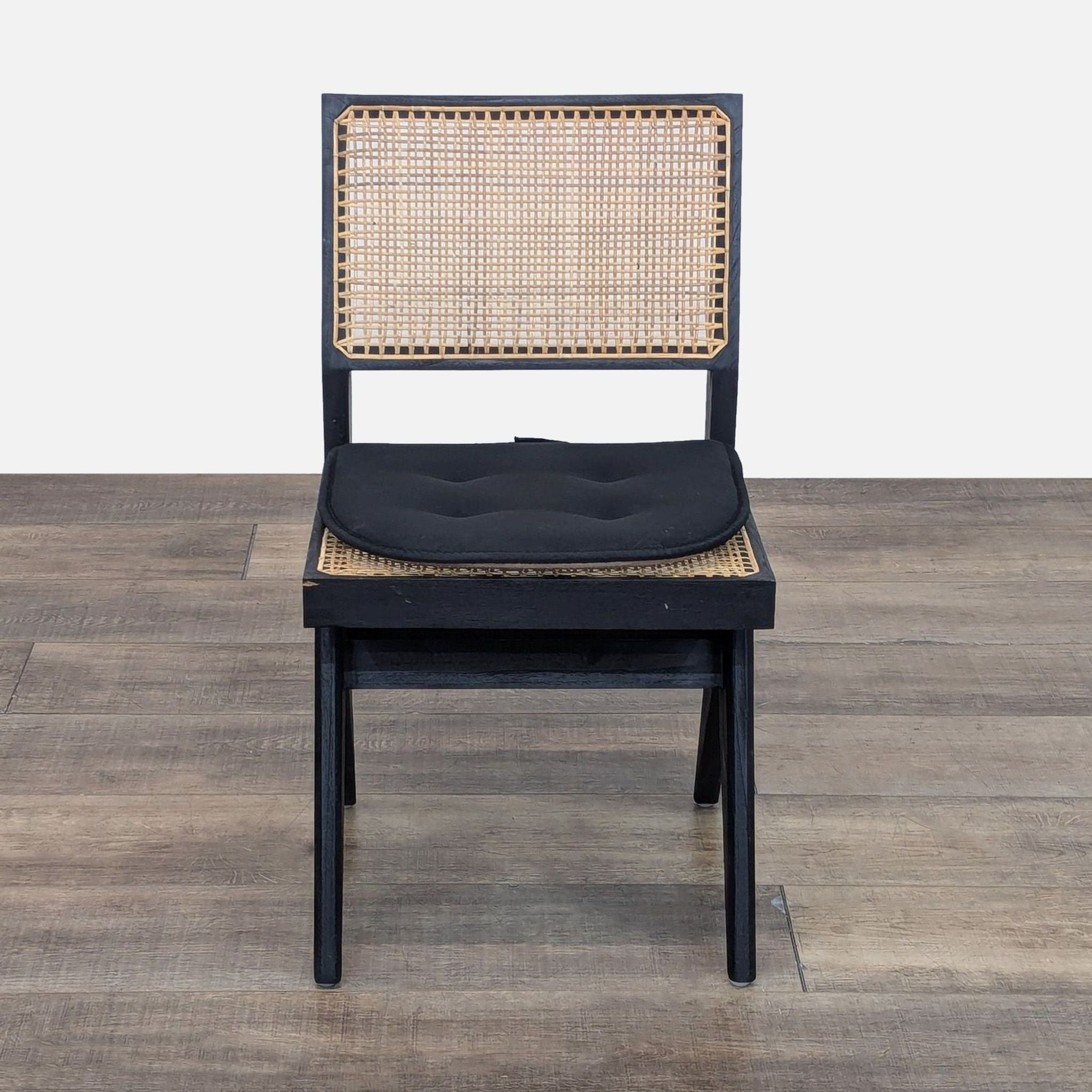 The chair is made of teak wood with rattan caning. The angular construction mirrors the arms of a compass. (Note: the chair is sold with the cushion, although it is not part of the original chair)