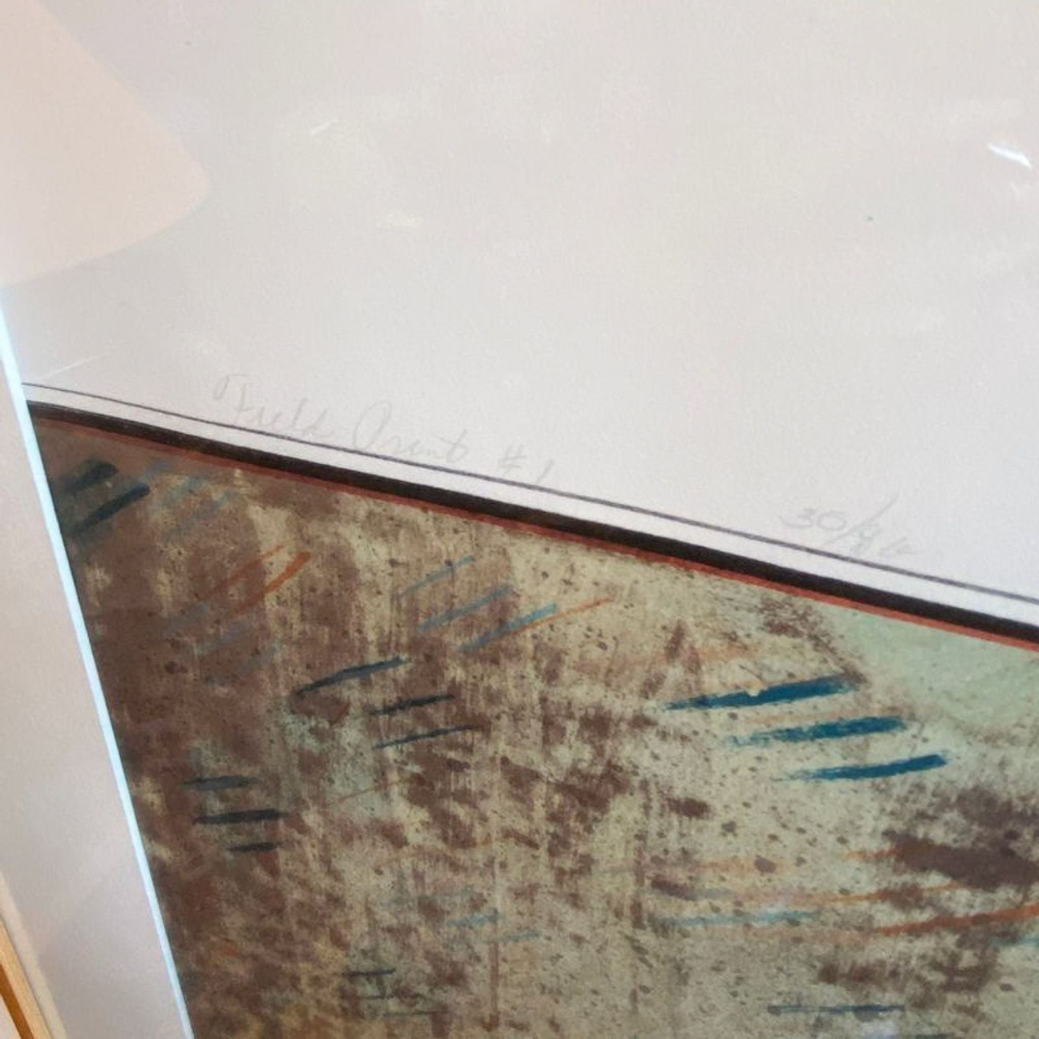This abstract limited Edition titled “Field Orient #1” comes framed and matted in a sleek wooden frame. Print 30 of 96.