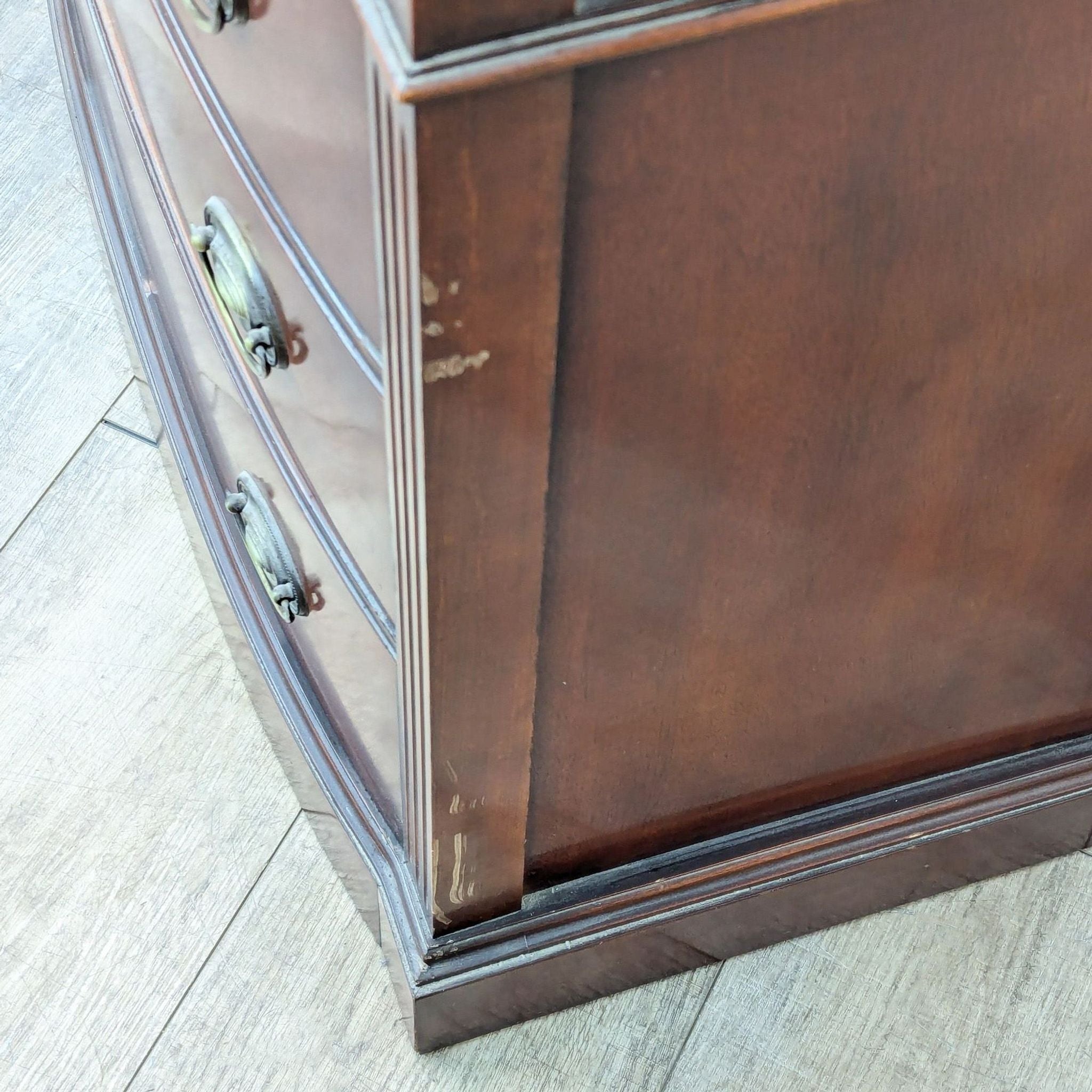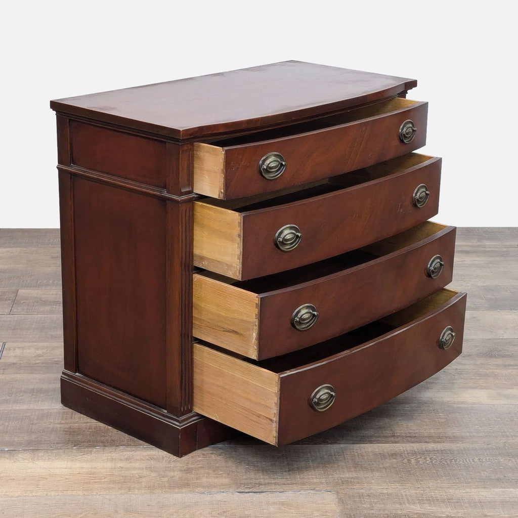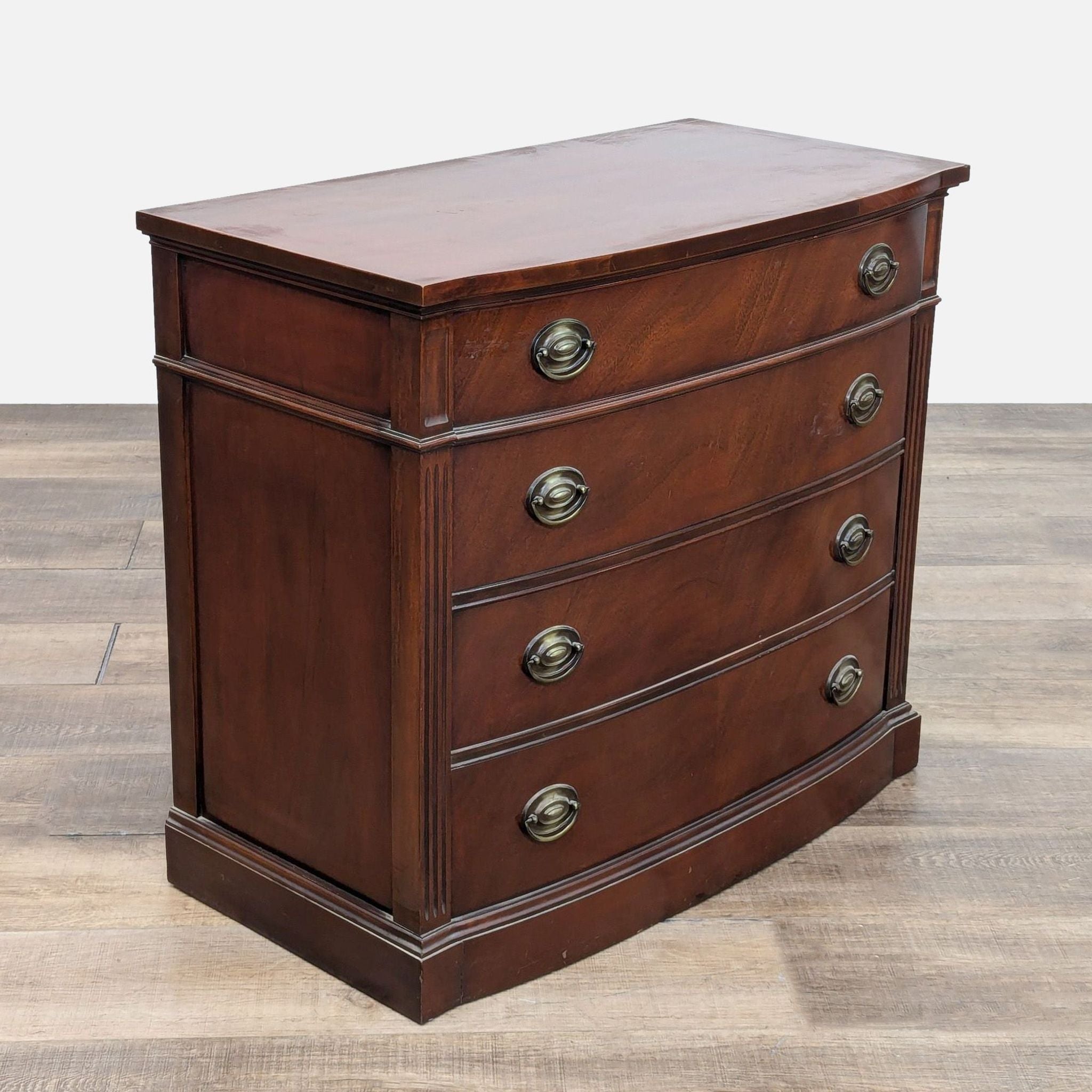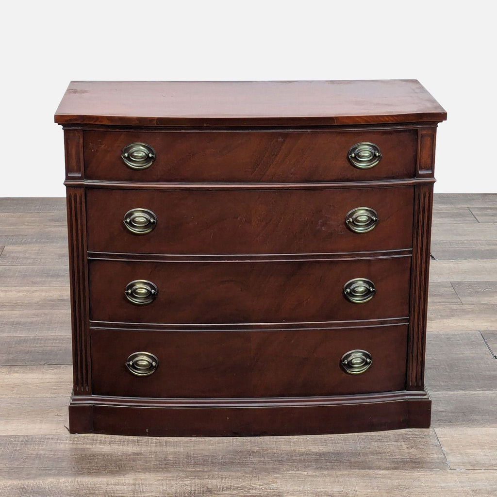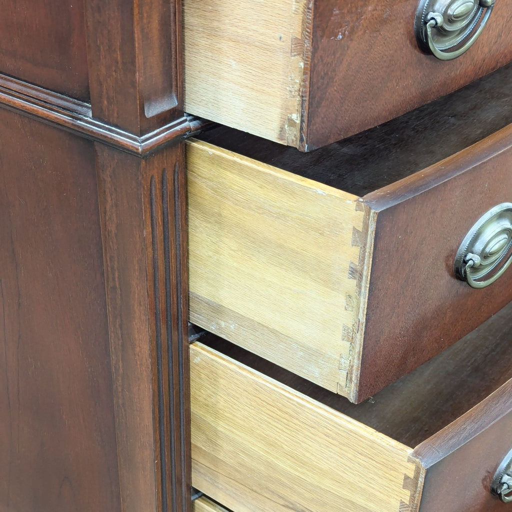 Vintage mahogany bow front four drawer dresser with dove tail joinery and brass drop ring pulls.