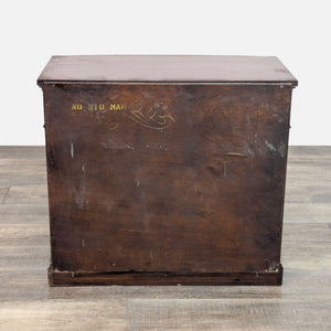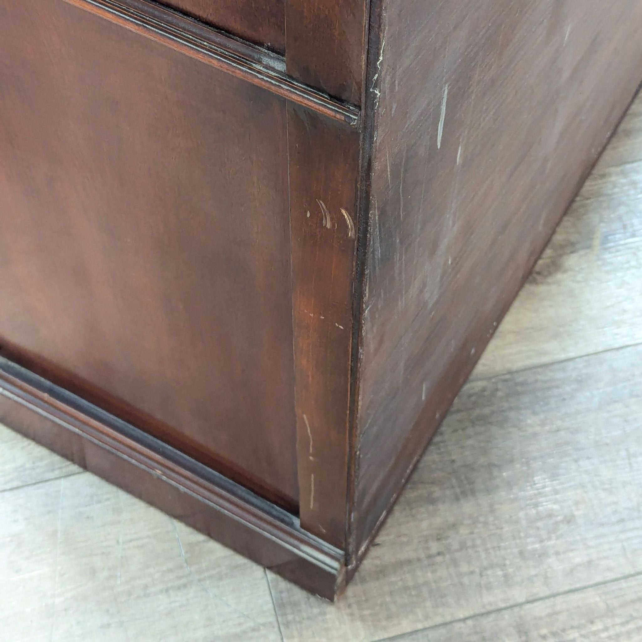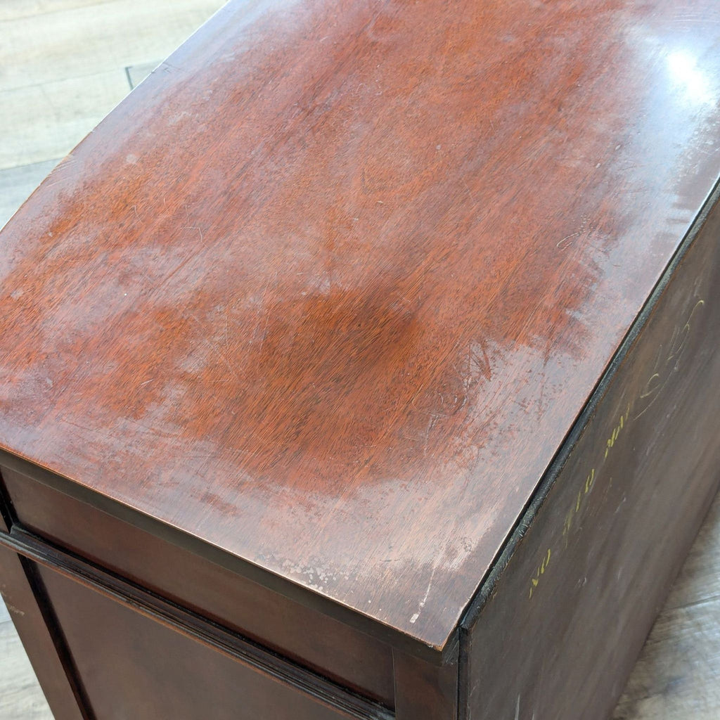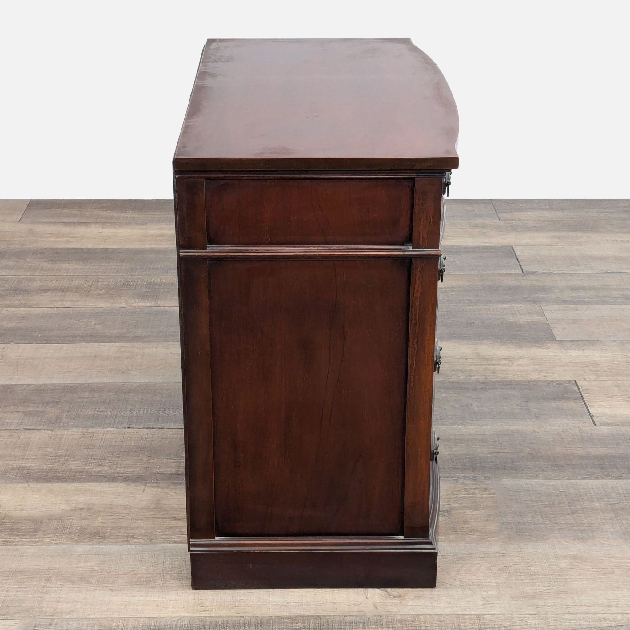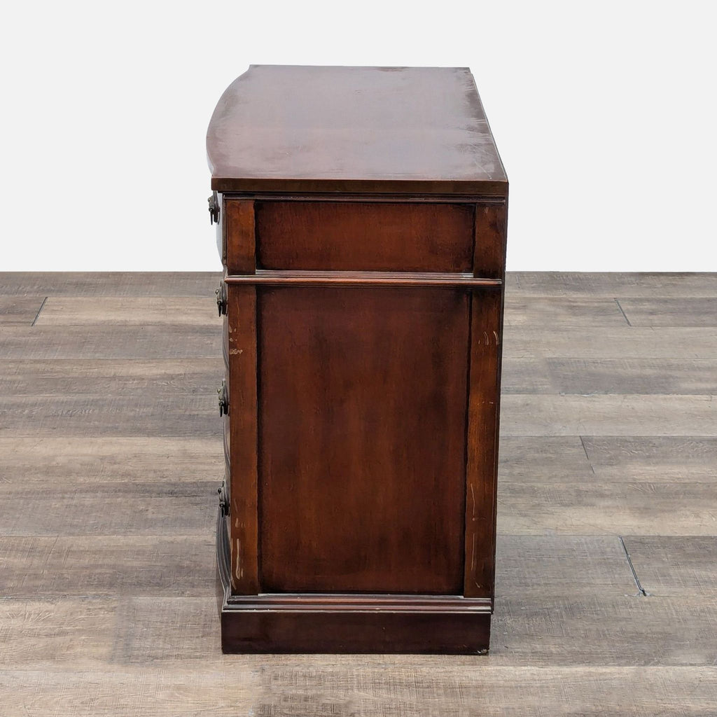 Vintage mahogany bow front four drawer dresser with dove tail joinery and brass drop ring pulls.