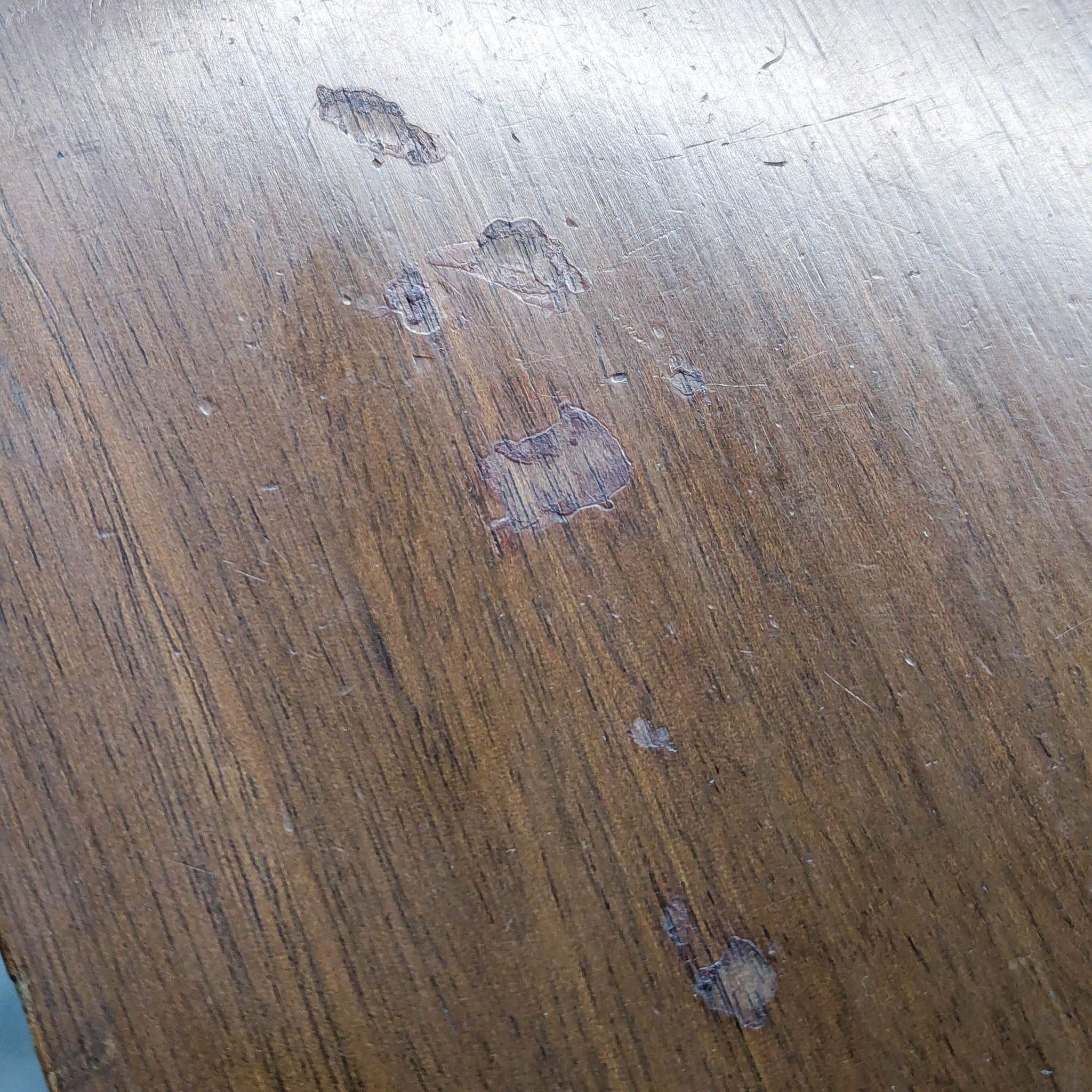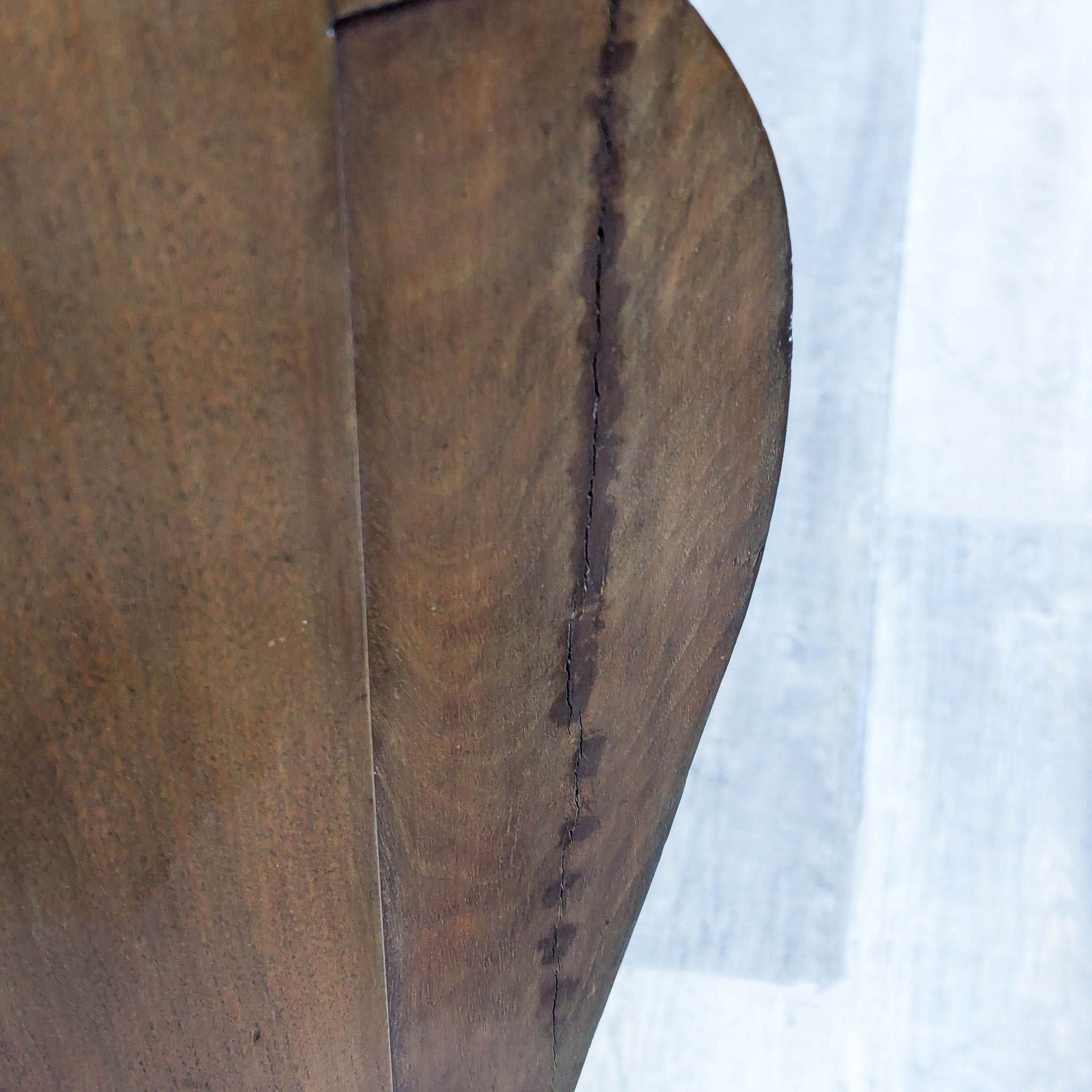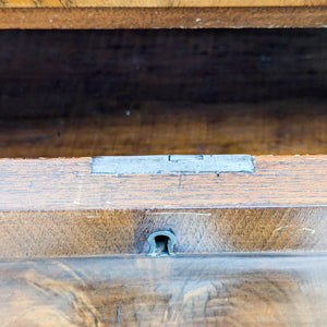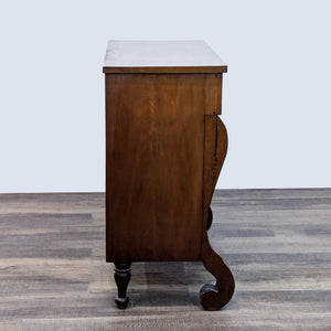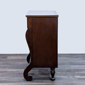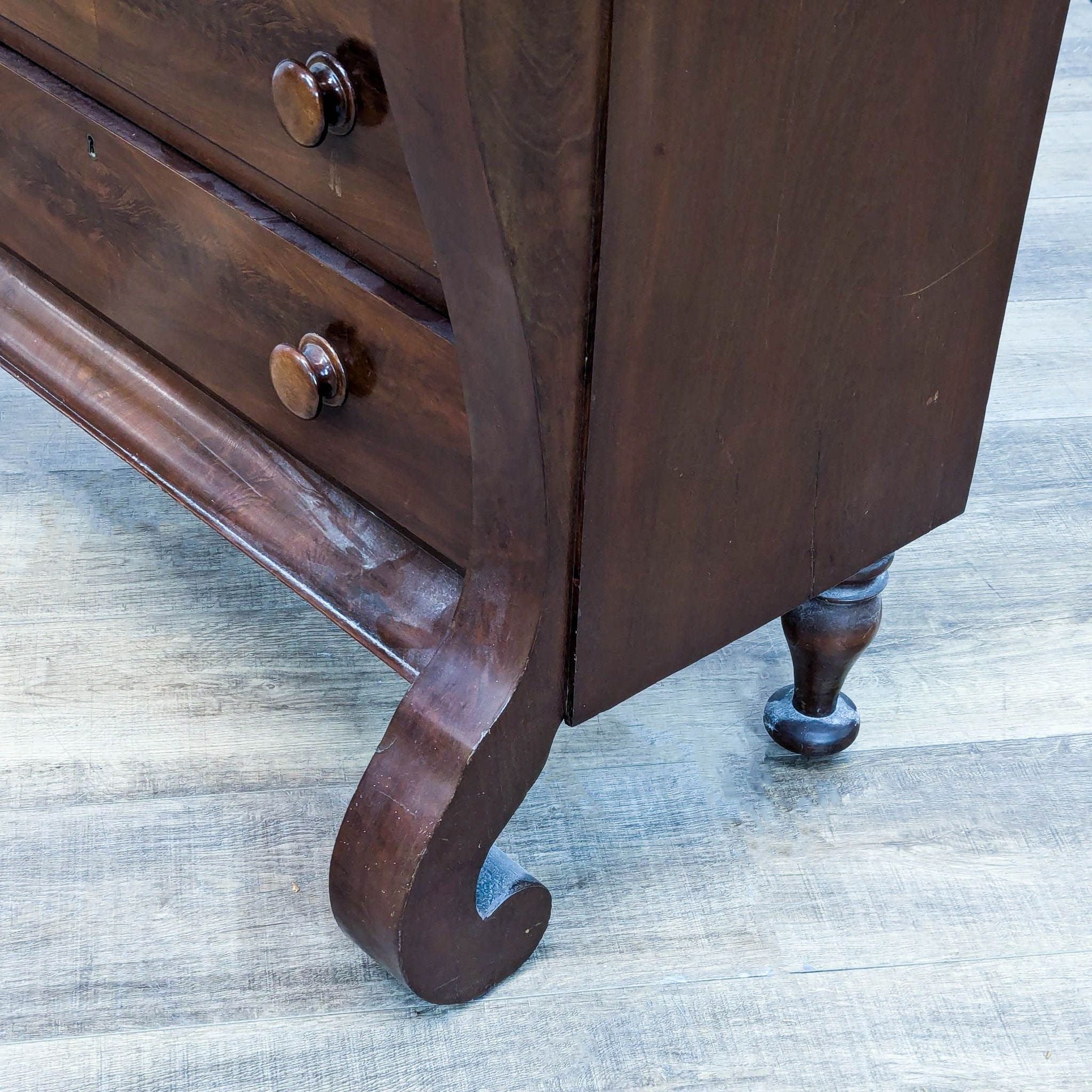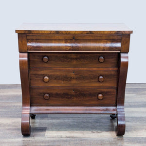 This antique Empire style chest of drawers is solid mahogany with classic Empire styling, with curved outward sides and curved back front feet. Features four drawers of dovetail construction with wooden knobs.