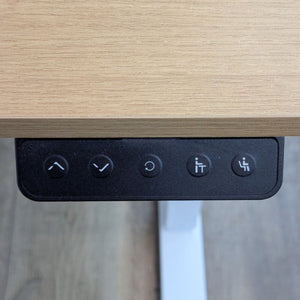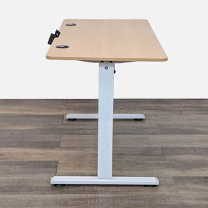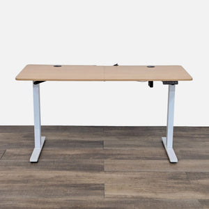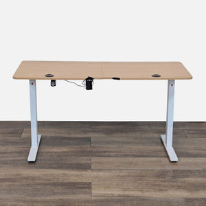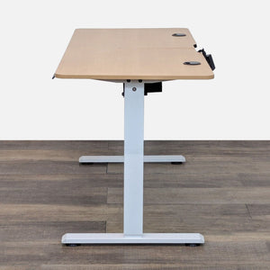 Adjustable electric desk with metal T-frame legs and a laminate top in an oak wood finish.