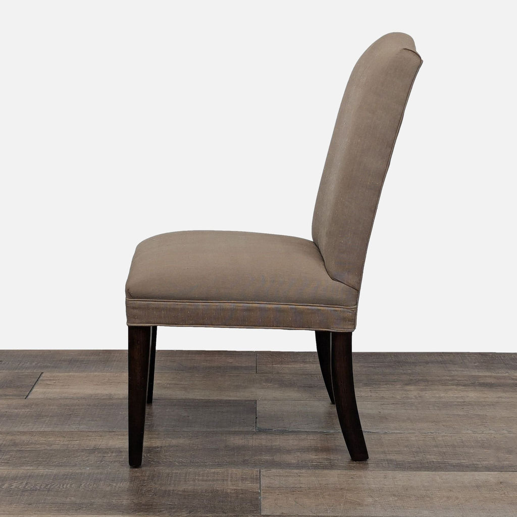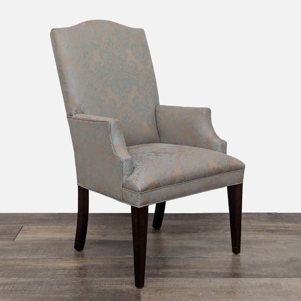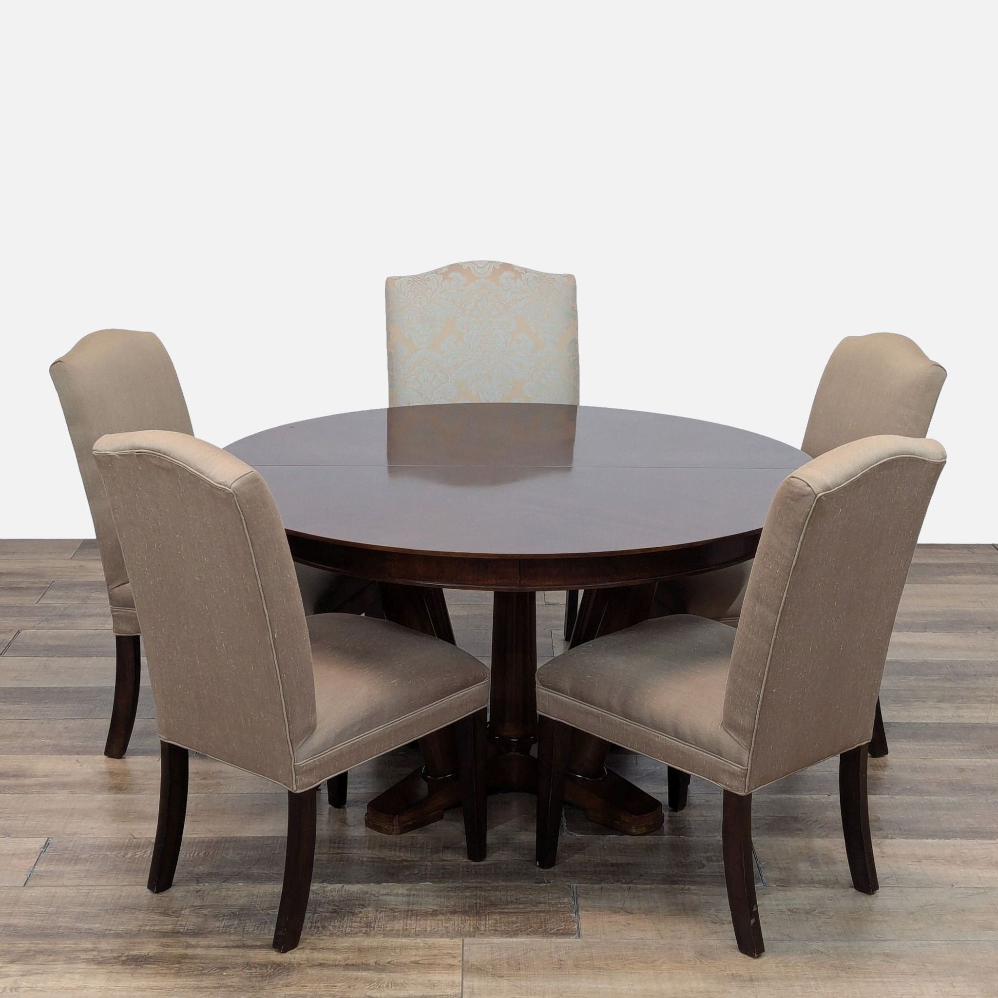 This Mitchell Gold + Bob Williams dining set features an extendable round dining table with four upholstered side chairs and one upholstered armchair.