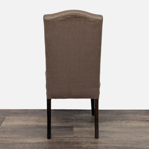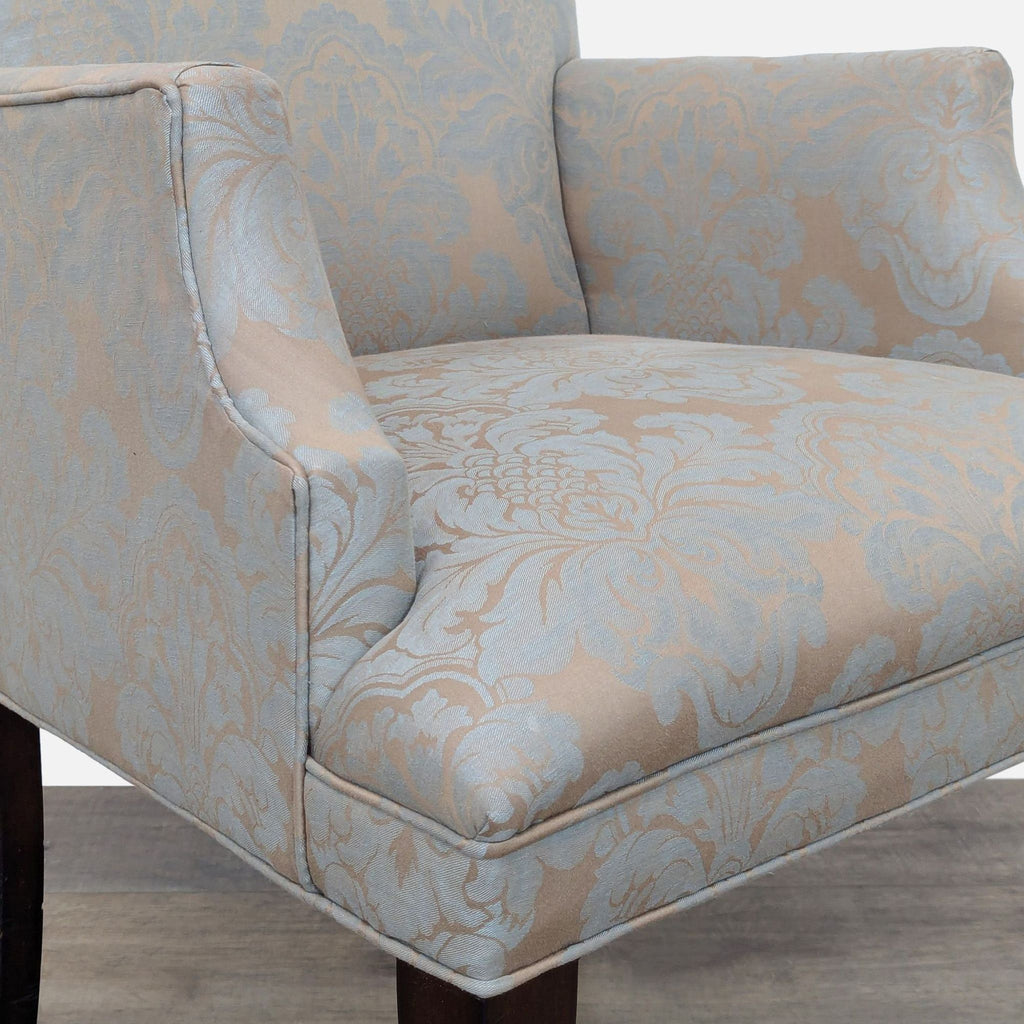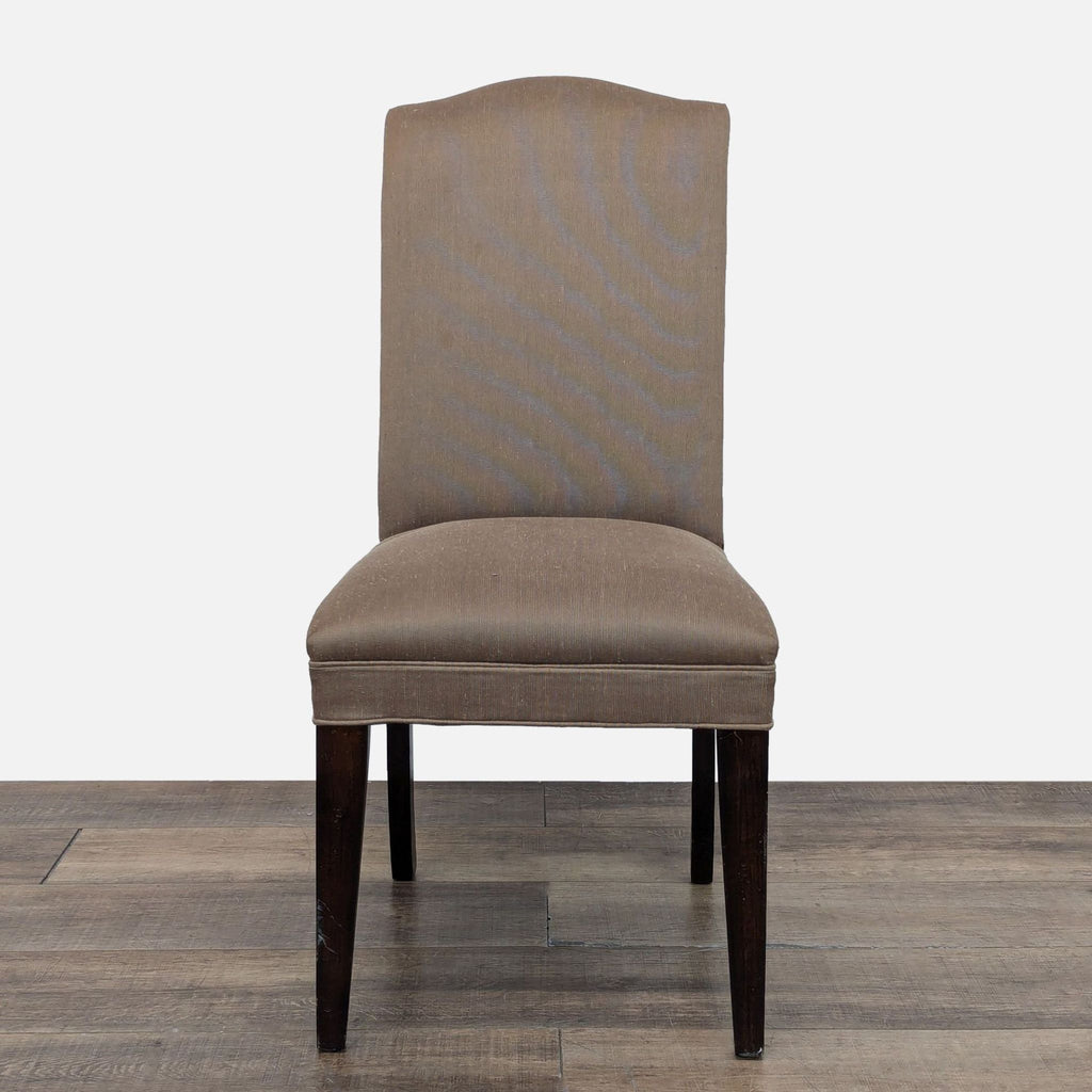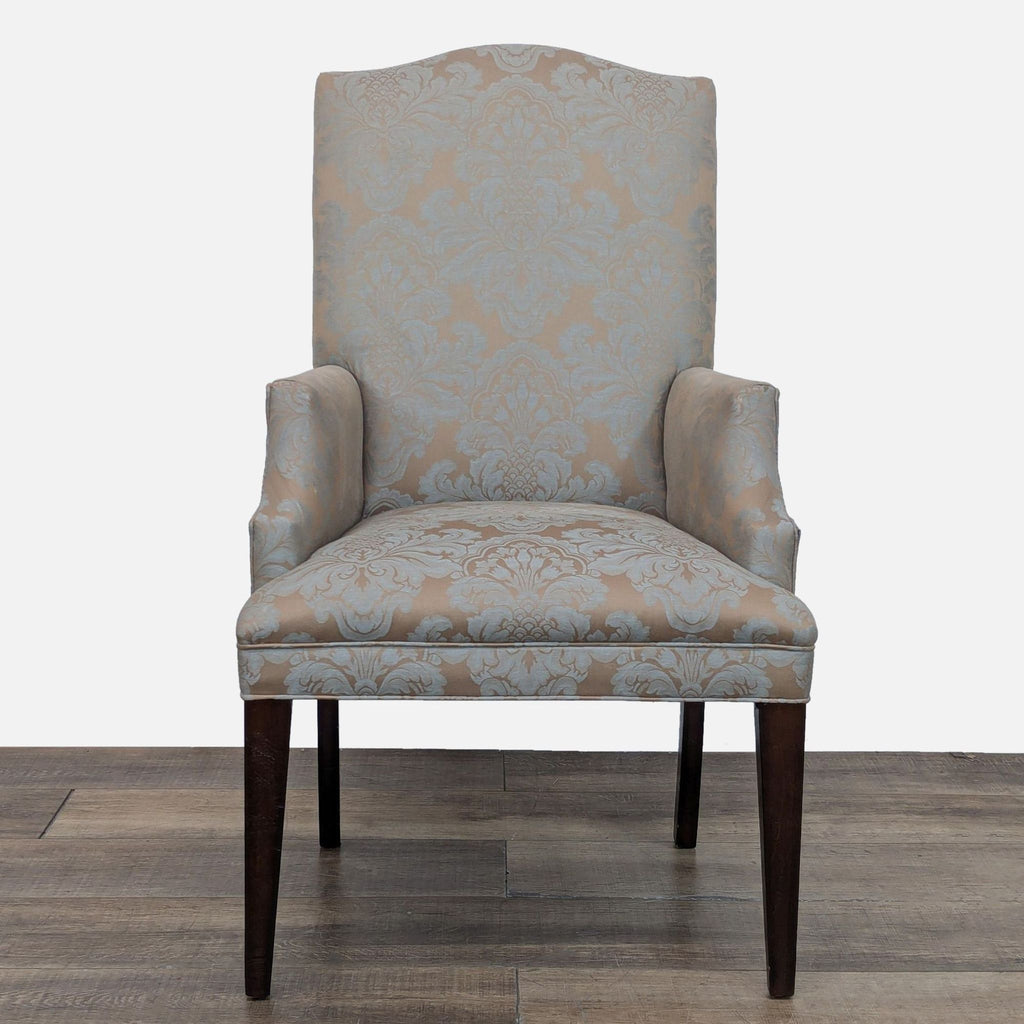 This Mitchell Gold + Bob Williams dining set features an extendable round dining table with four upholstered side chairs and one upholstered armchair.