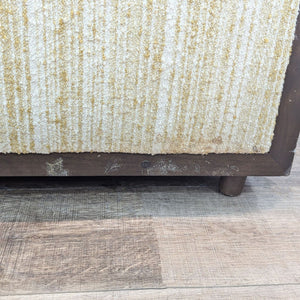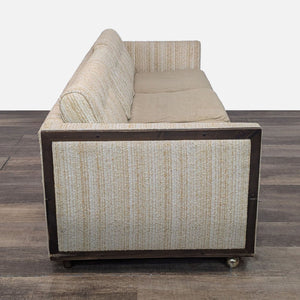 Vintage sofa with wood frame, front caster wheels and cream fabric.
