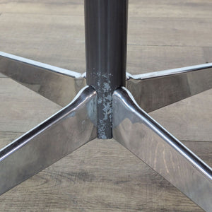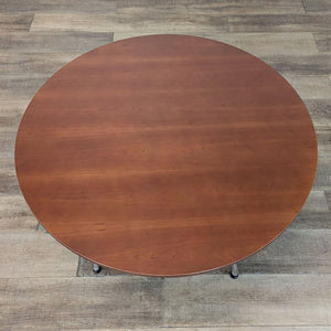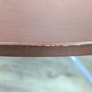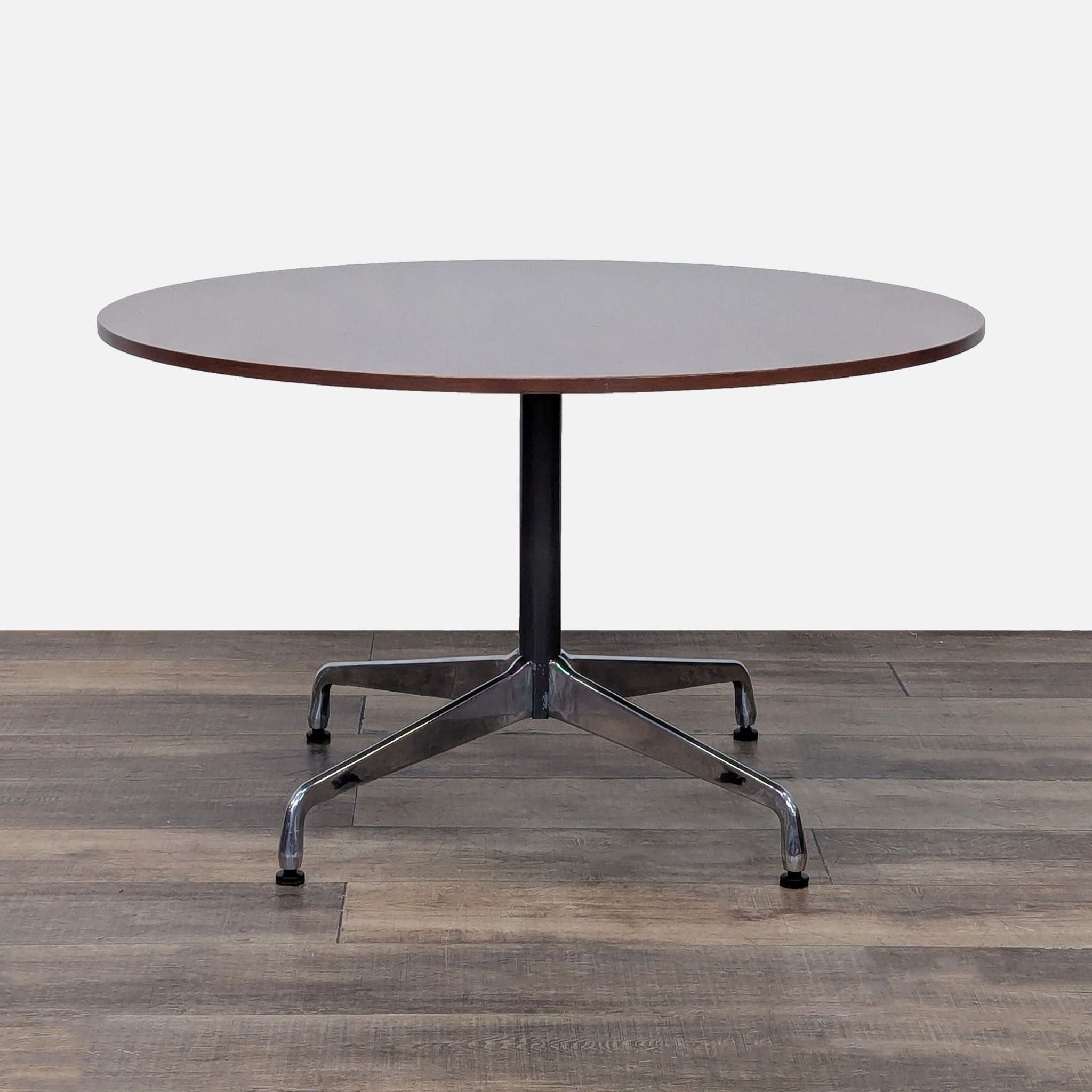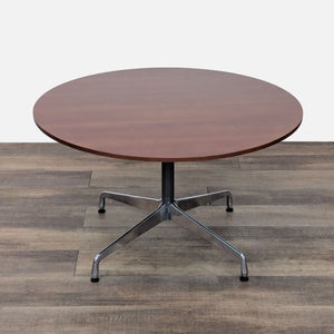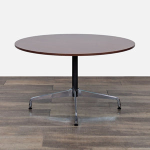 The versatile Eames Table (1964) is a durable, simple, sleek solution for residential and commercial settings. It features a sturdy streamlined base and leveling floor glides for uneven surfaces. The table is constructed of varying percentages of recycled and recyclable materials. The table has a stainless-steel base and a veneered walnut top in a cherry finish.