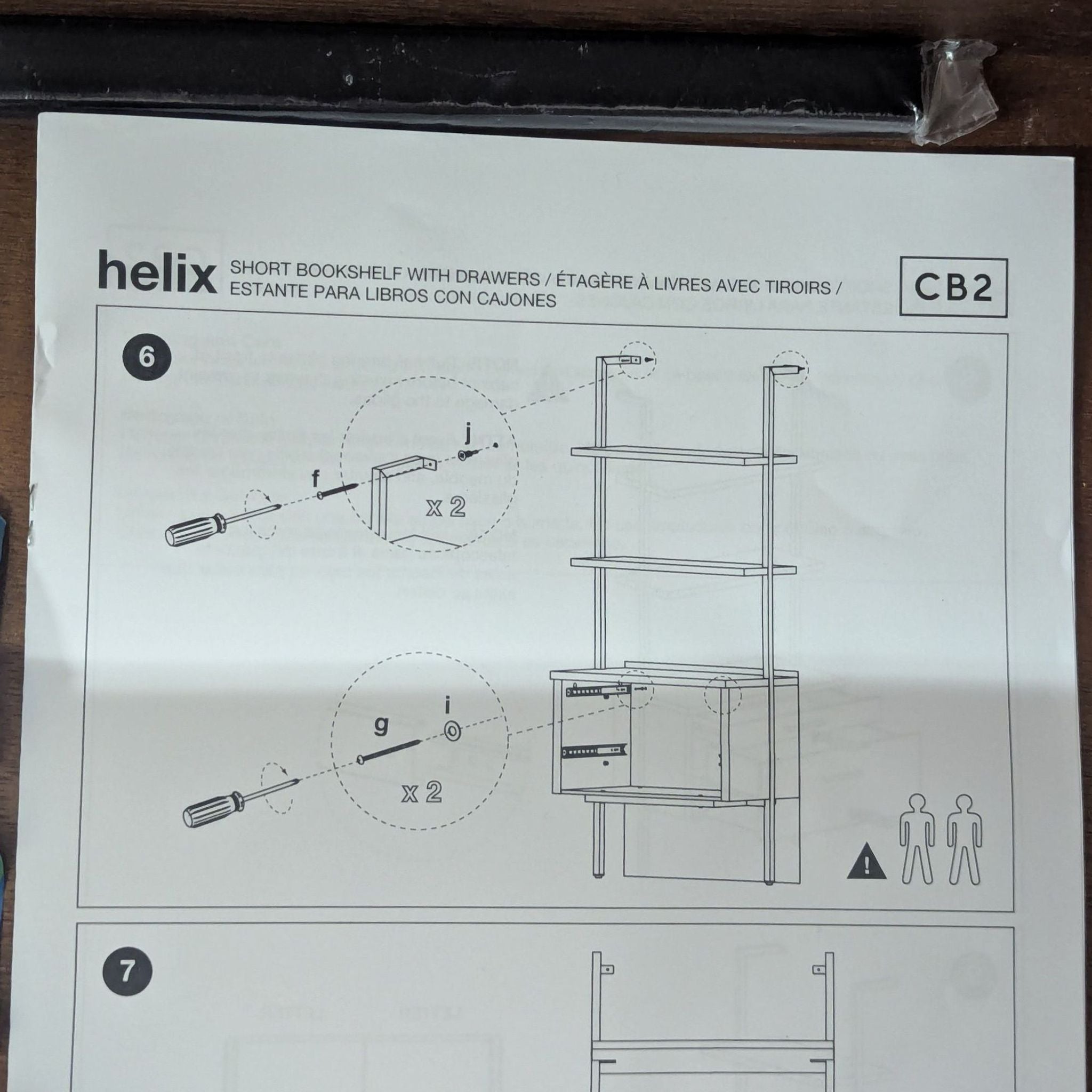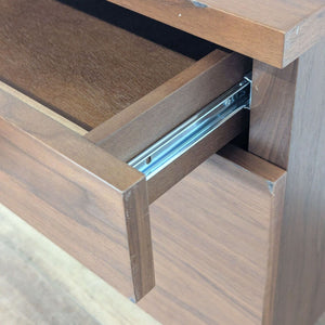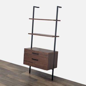 Constructed of a black powder coated frame with walnut veneer shelves and two drawers on metal glides.
