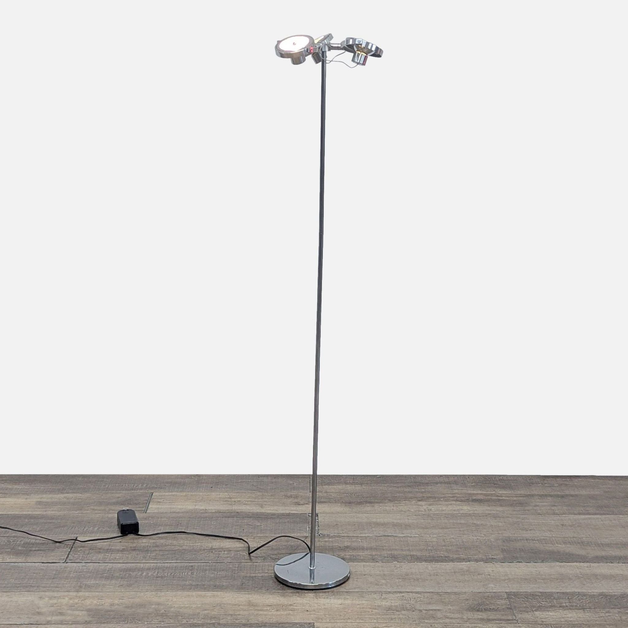 Postmodern-style lamp known for its adjustable, articulated spotlights and silver chrome finish. It features three light projectors that can be directed independently and dimmed to suit different moods.
