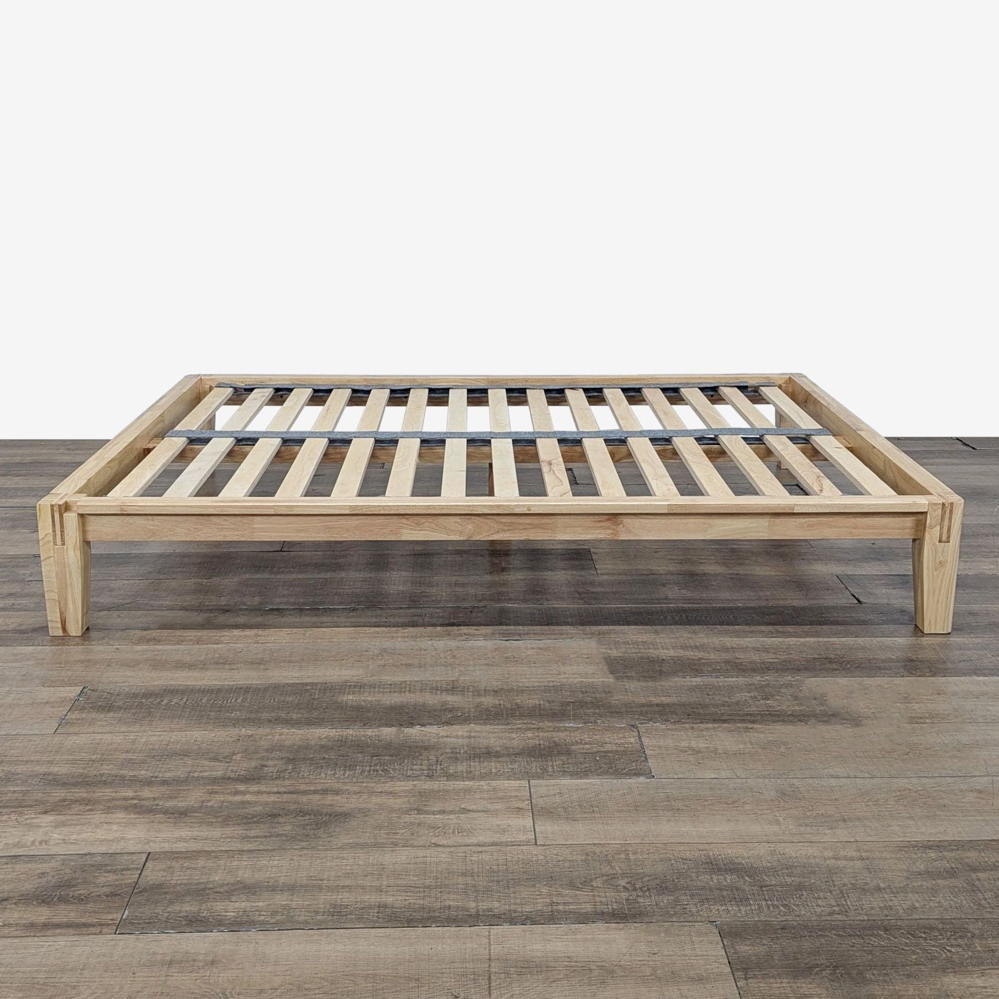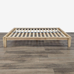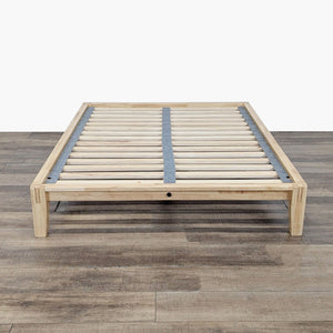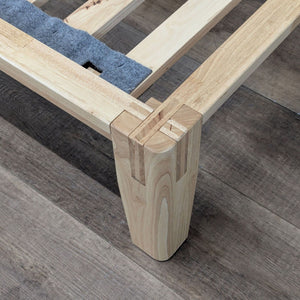 Features wood platform bed frame with slats and Japanese joinery and includes the upholstered Pillowboard.