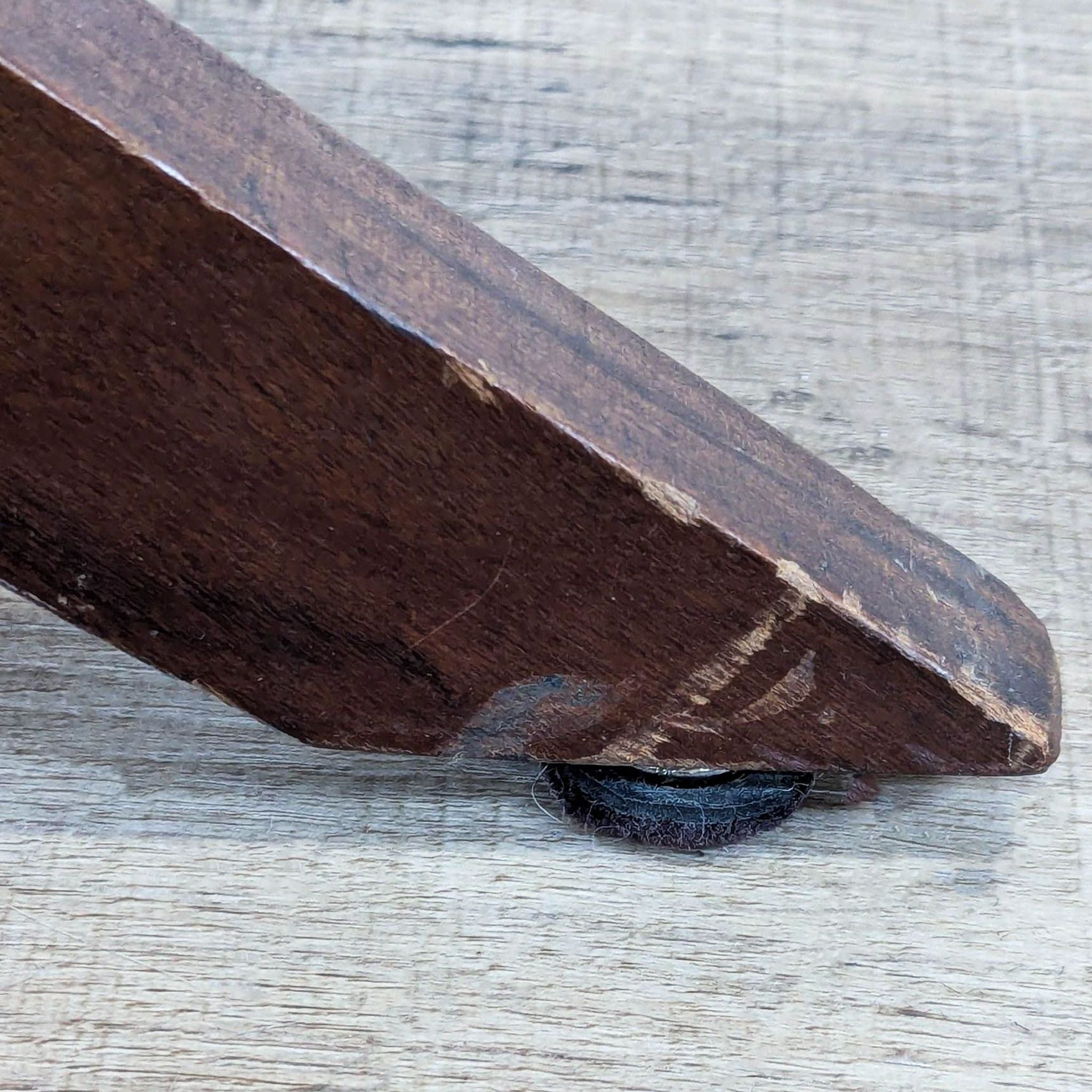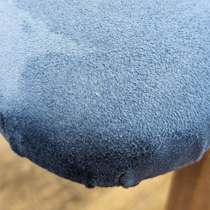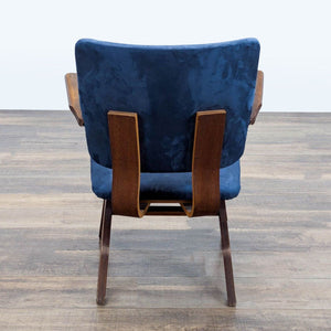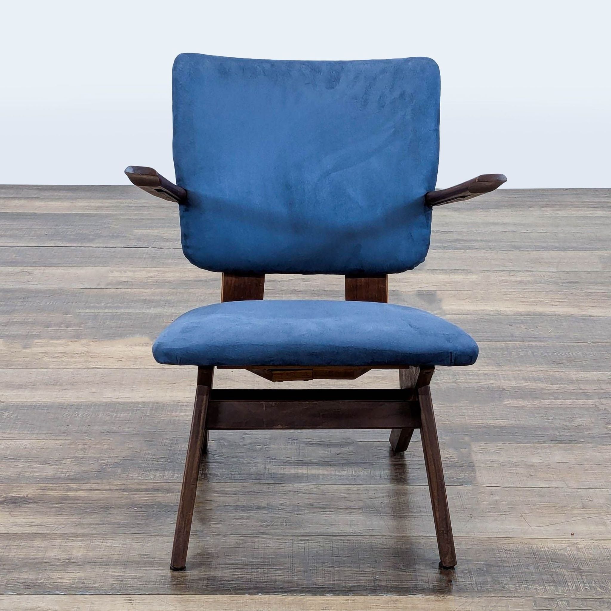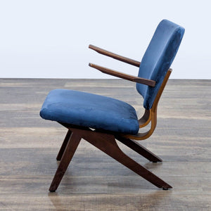 This is a mid-century modern armchair with a dark wood frame and blue upholstered cushions on the seat and backrest. The design features clean lines, a slightly angled back, and angled legs.