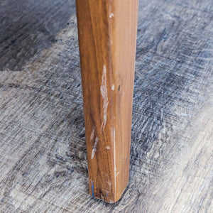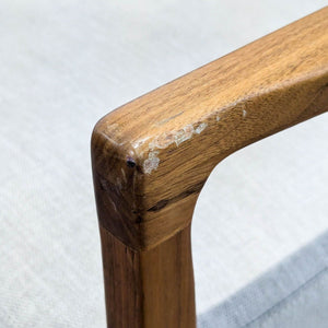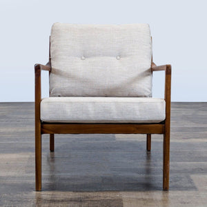 This chair features a solid wood frame with a slatted back, tapered legs and upholstered cushions.