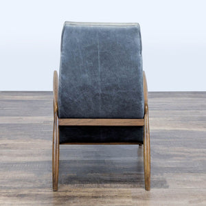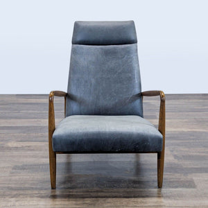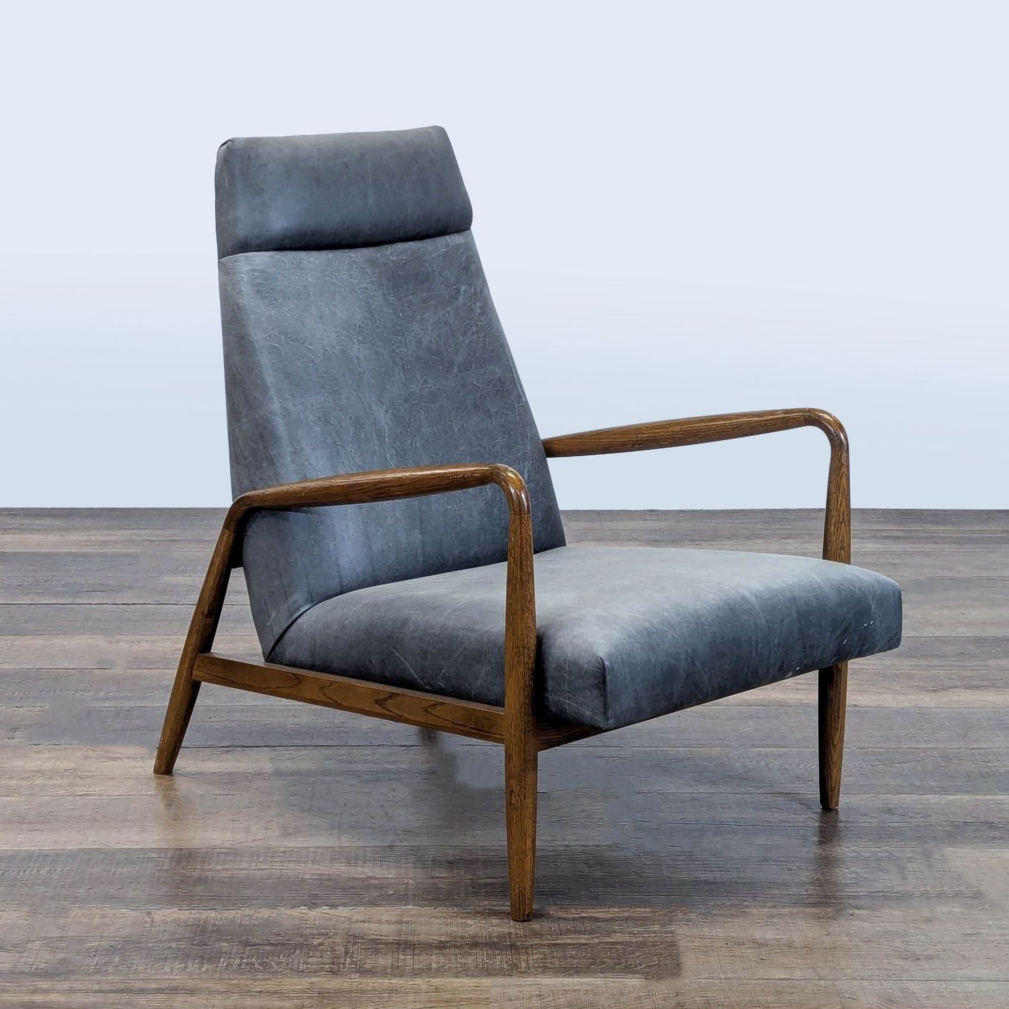 This chair has a mid-century modern design with a high back and sculpted wooden arms and legs.
