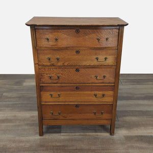 Constructed of oak wood with 5 drawers featuring dovetail joinery and brass bail pulls.