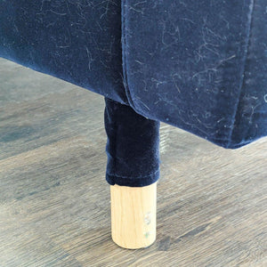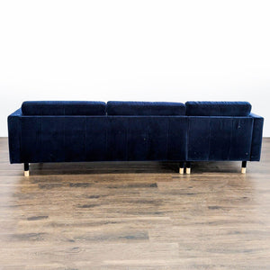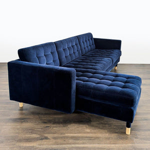 This IKEA sectional sofa features a modern, tufted design with deep navy blue velvet upholstery. The chaise provides extra comfort for lounging, and the sturdy wooden legs add a clean look. Perfect for any living room, this sectional offers plenty of seating and a cozy, stylish touch to your space. Gently used and in great condition.