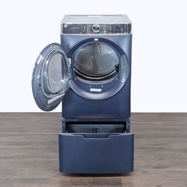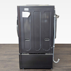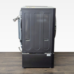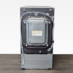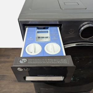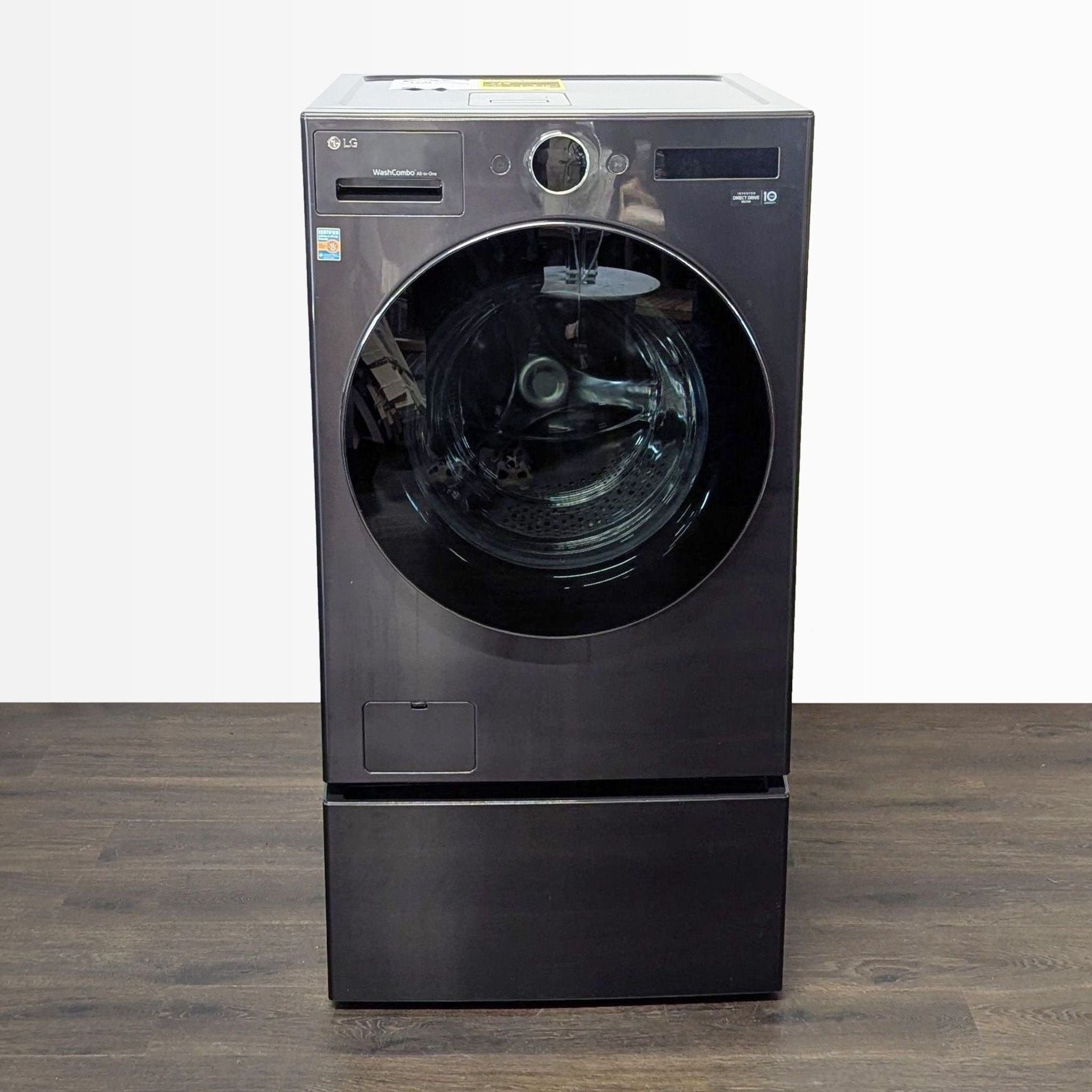 This LG washer/dryer combo offers efficient washing and drying in a single unit. It features a modern black finish, front-loading design, and is equipped with a spacious drum. The machine includes a pedestal for added storage and convenience. Perfect for saving space and simplifying laundry at home.
