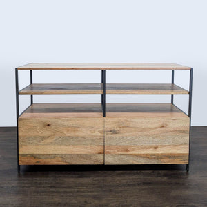Mango wood cabinet with 2 doors and 2 shelves on a blackened steel frame. Each cabinet has an adjustable shelf and media outlets.