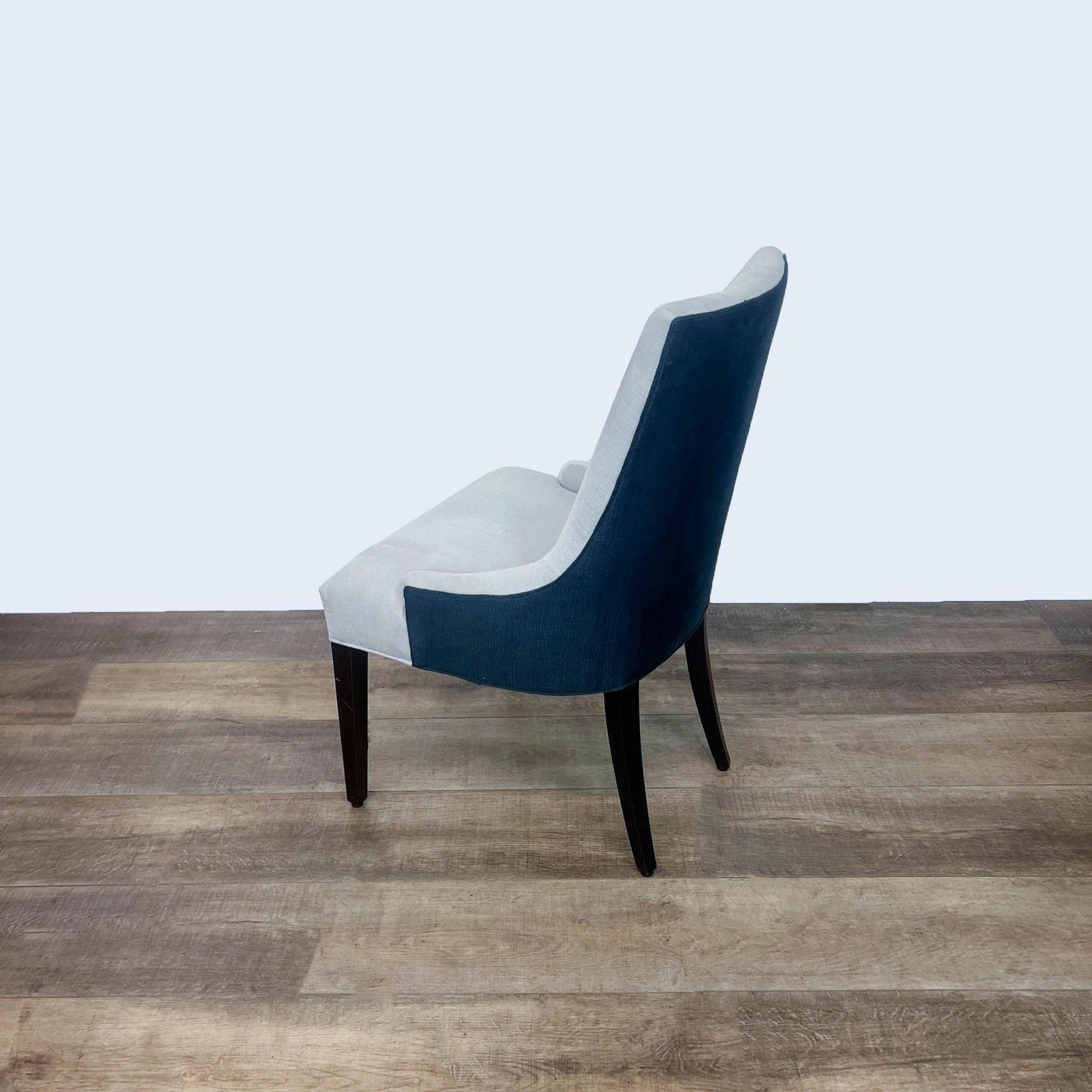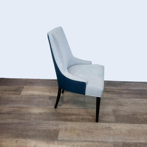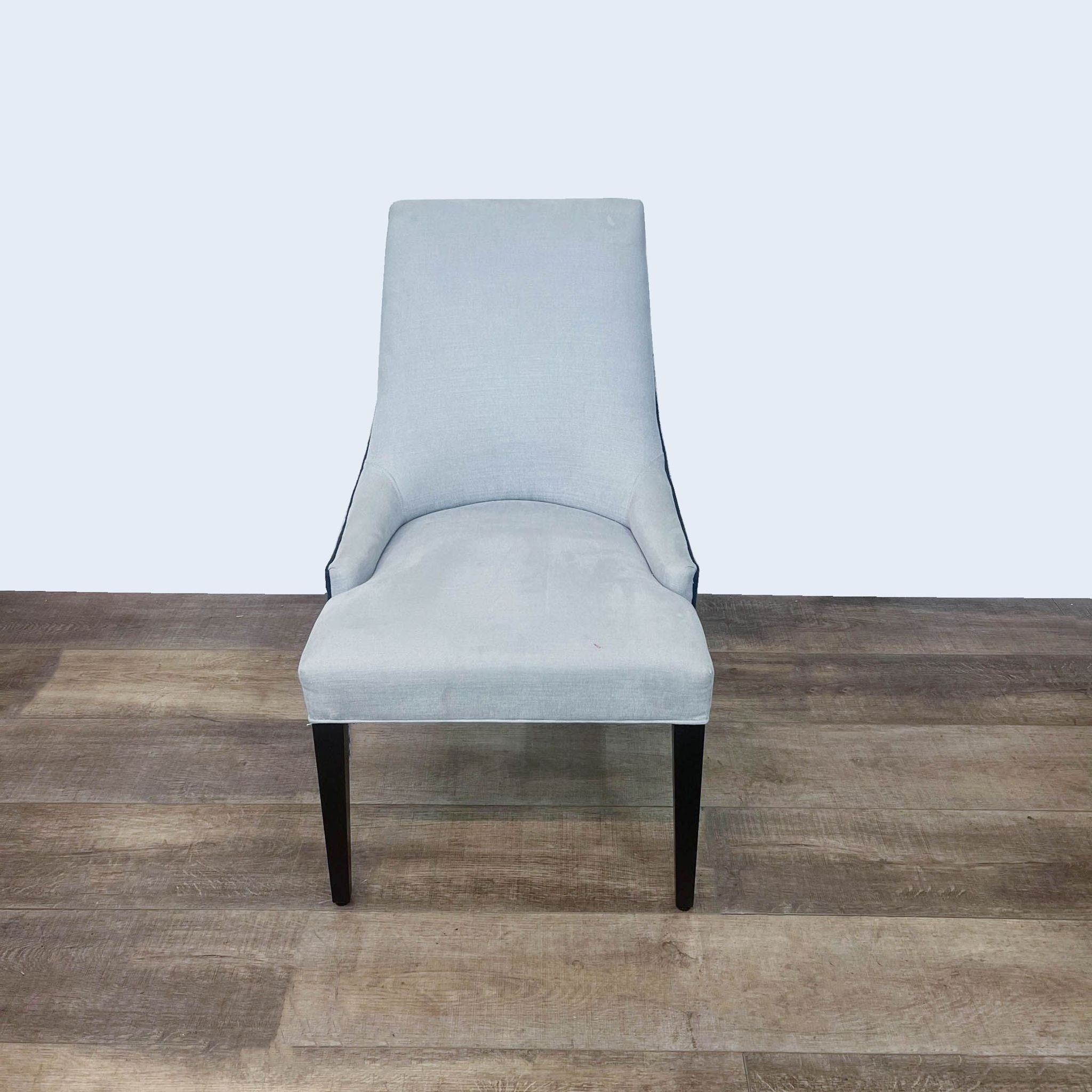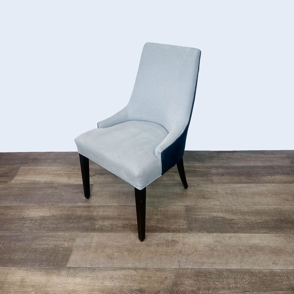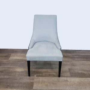 This contemporary dining chair features a clean-lined high back, armless design, finished with tapered solid wood legs. The cushioned seat and back is custom upholstered in two toned Duralee fabric.